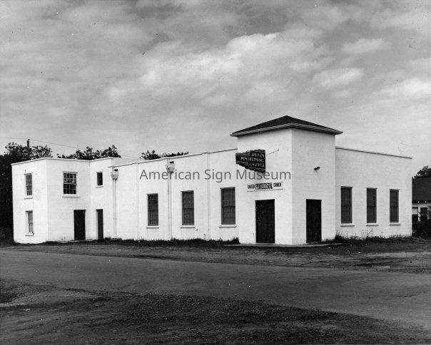 This large, double-faced porcelain enamel and neon sign for "United Pentecostal Church" is from the late 1940s. It was designed to project at a right angle from the original building, a church in Shreveport, LA. It has a single, bullnose-end, flat dark, subdued blue background with white border outlines in a stepped, Art Deco- and Streamline Modern-inspired pattern.