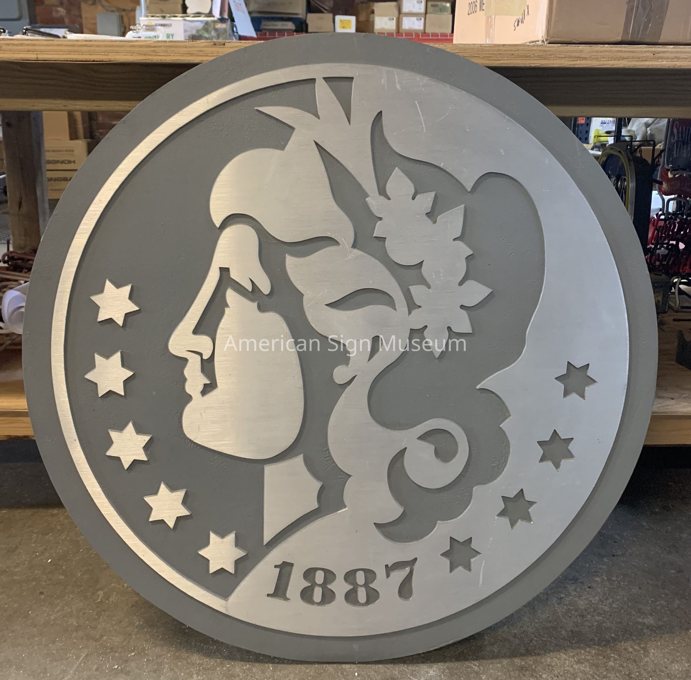 Cast aluminum logo is replica of US silver dollar.