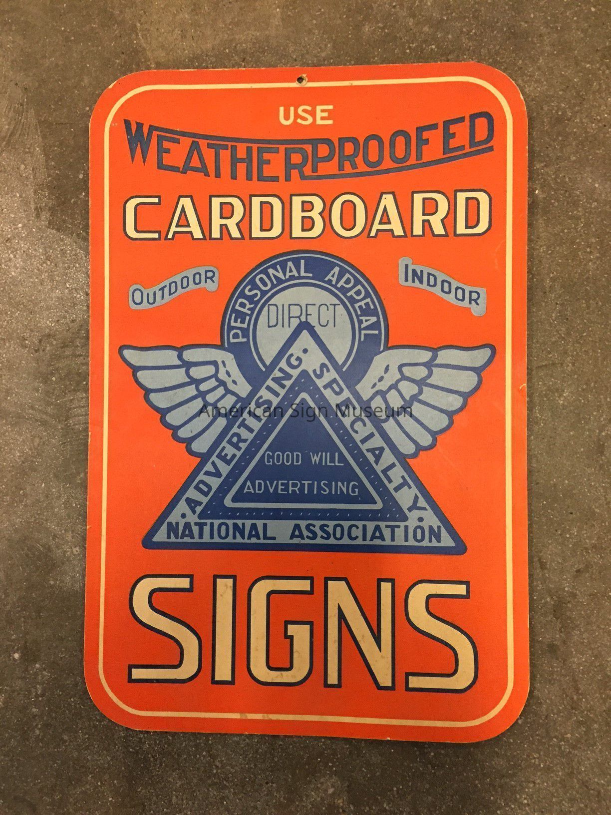 Three-color printed cardboard sign in red, dark blue and yellow, reads, "Use weatherproofed cardboard signs" and was a promotion by the Advertising Specialty National AssociationCollection