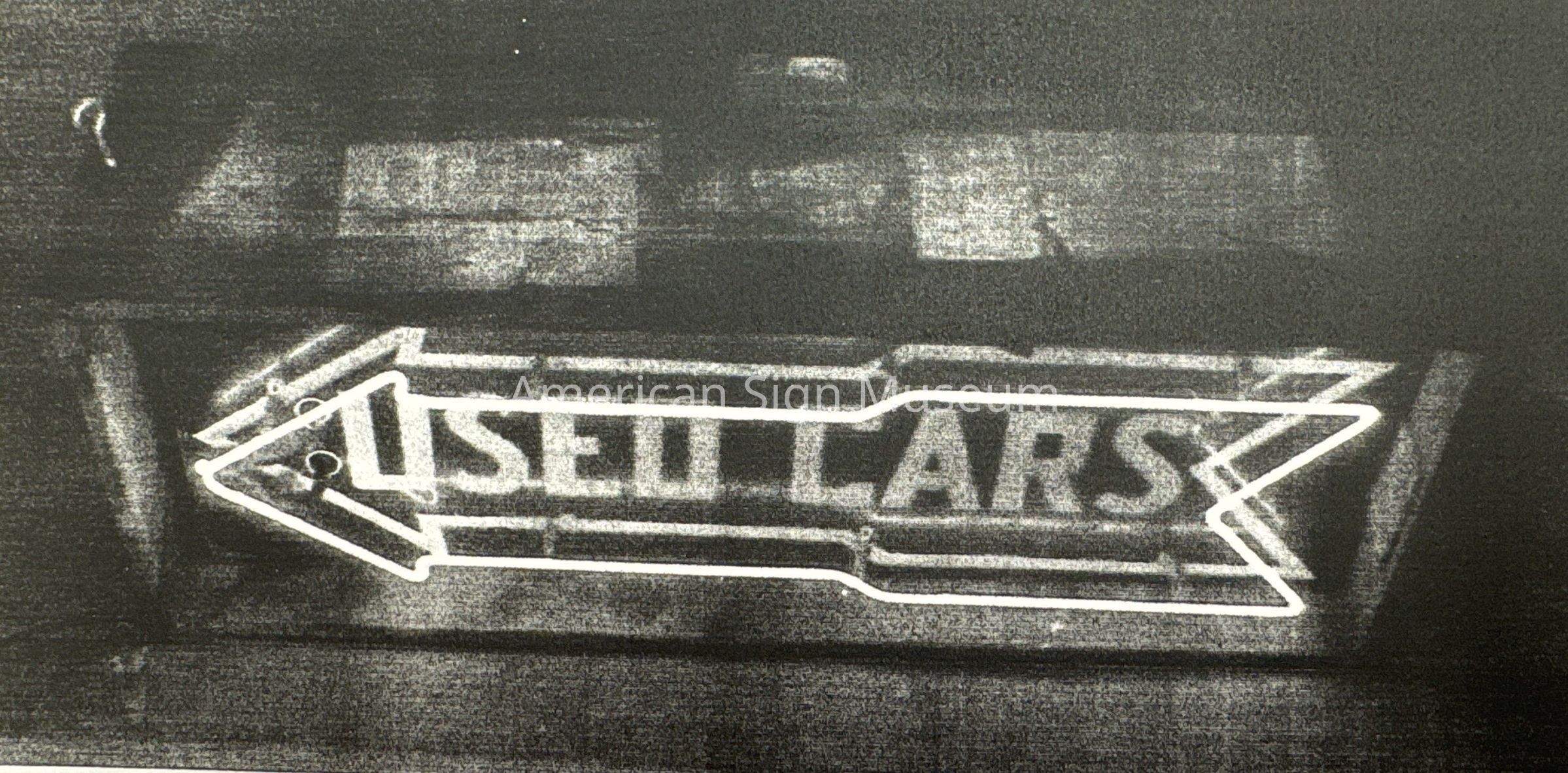 Double-faced, tin sign says "USED CARS", has neon arrow and is in original shipping crate making it new-old-stock, (NOS).Collection