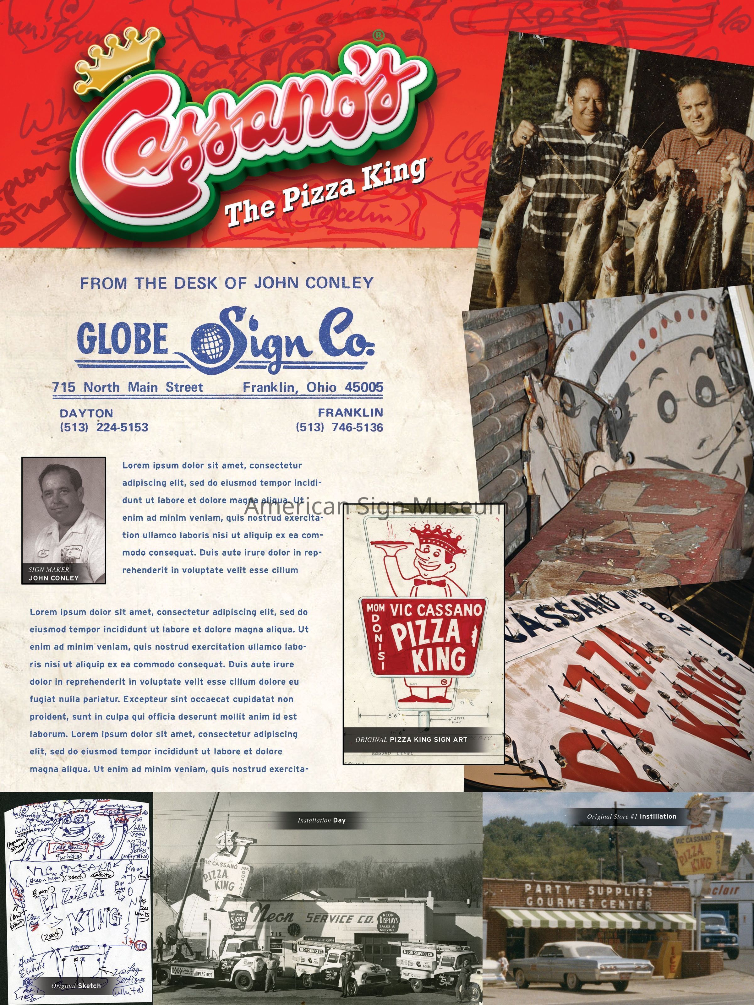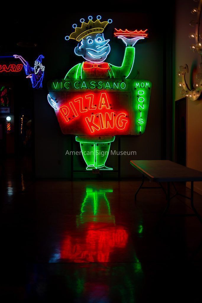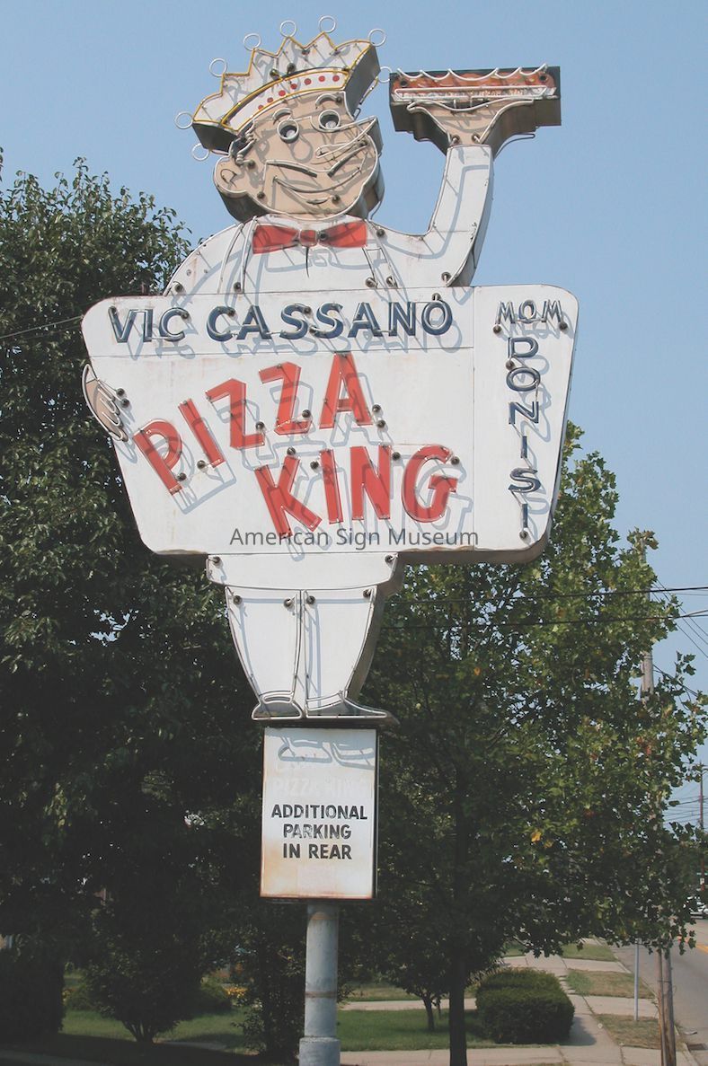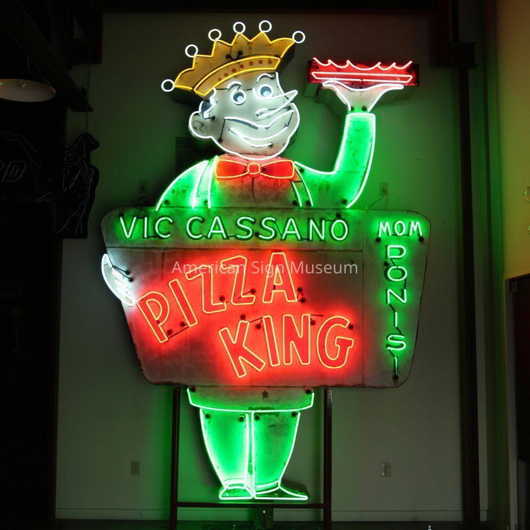 Vic Cassano's Pizza King is double-faced, porcelain enamel neon sign.