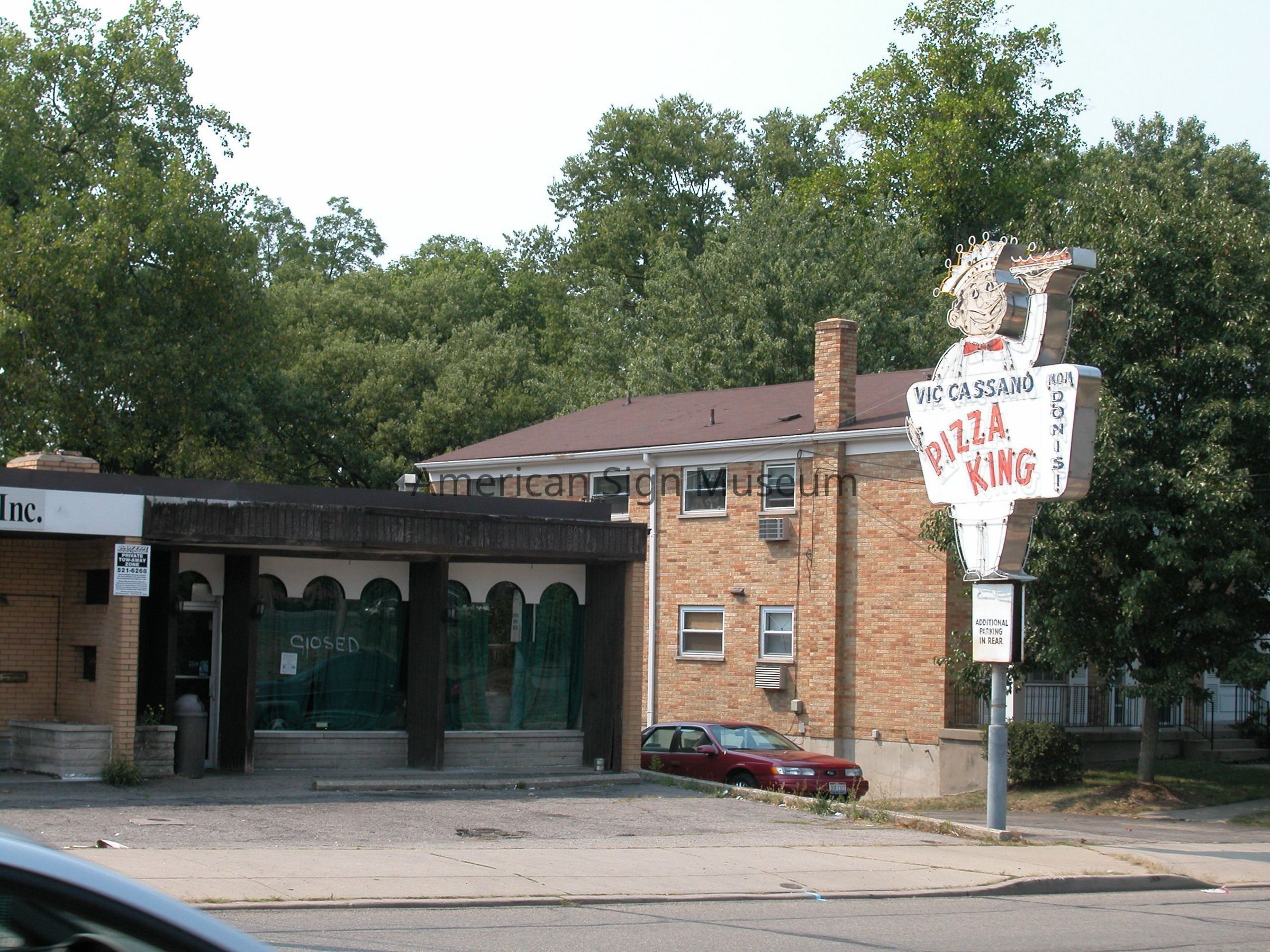 Sign originally identified the Pizza King store near the corner of West Galbraith and Daly Road in Finneytown, Cincinnati. Pizza King is headquartered in Dayton, OH; the Finneytown location was one of two in Cincinnati, the other being part of the Fairfield area. Pizza King was known for its little square slices of pizza. Sign was removed by United-Maier Signs gratis; neon was removed prior to takedown to prevent breaking.Collection