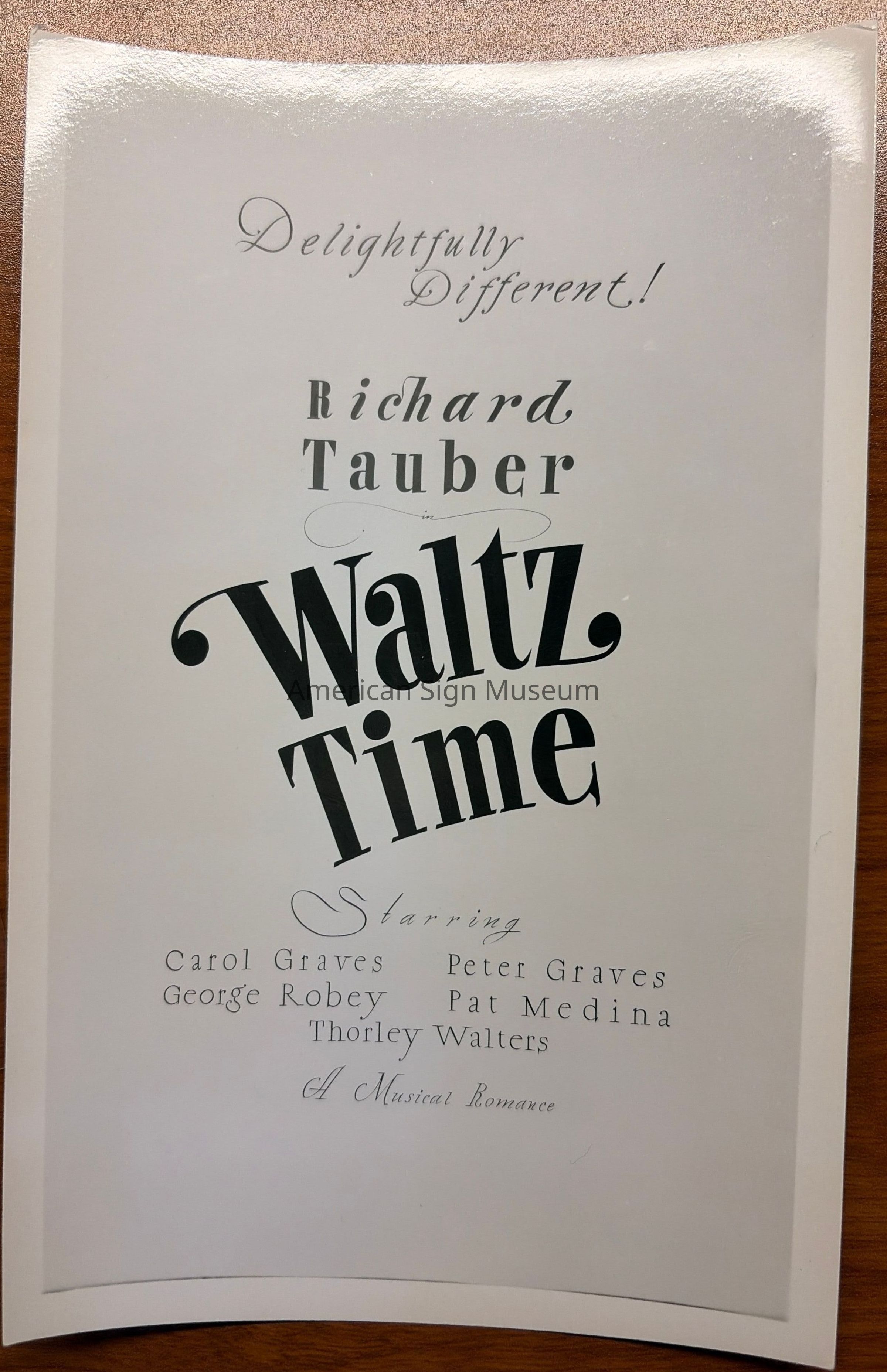 Black and white photograph of a show card reading "Delightfully Different! Richard Tauber Waltz Time Starring Carol Graves Peter Graves George Robey Pat Medina Thorley Walters A Musical Romance". Made by Don Sturdivant.Collection