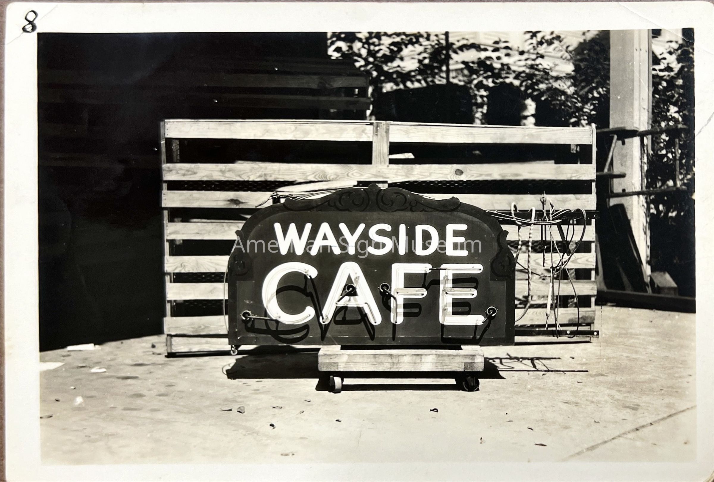 B&W photograph of early neon sign 1930-1940s - Wayside Cafe. (See also 1999.0008.0077)