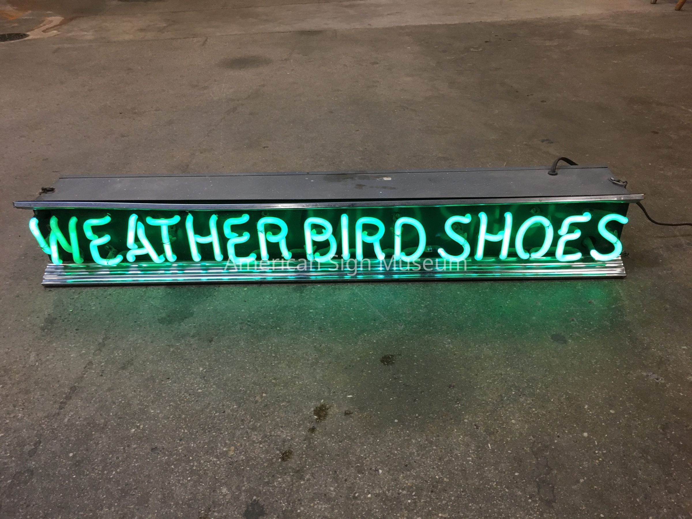 Neon-illuminated sign for "Weatherbird Shoes" is a metal cabinet with stainless steel trim top and bottom. Brackets on each end of top of cabinet for hanging sign with chains. It was for point-of-purchase, or POP.Collection