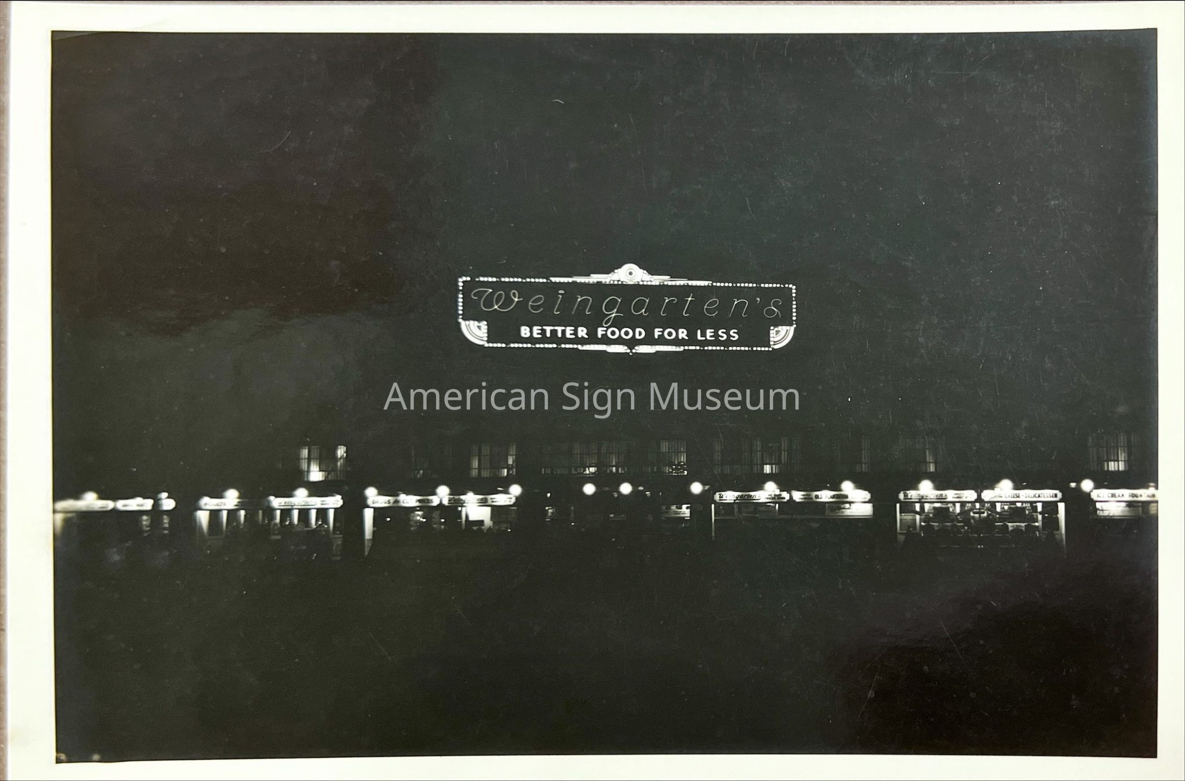 B&W photograph of early neon sign 1930-1940s - Weingarten's. Photo was taken at night.
