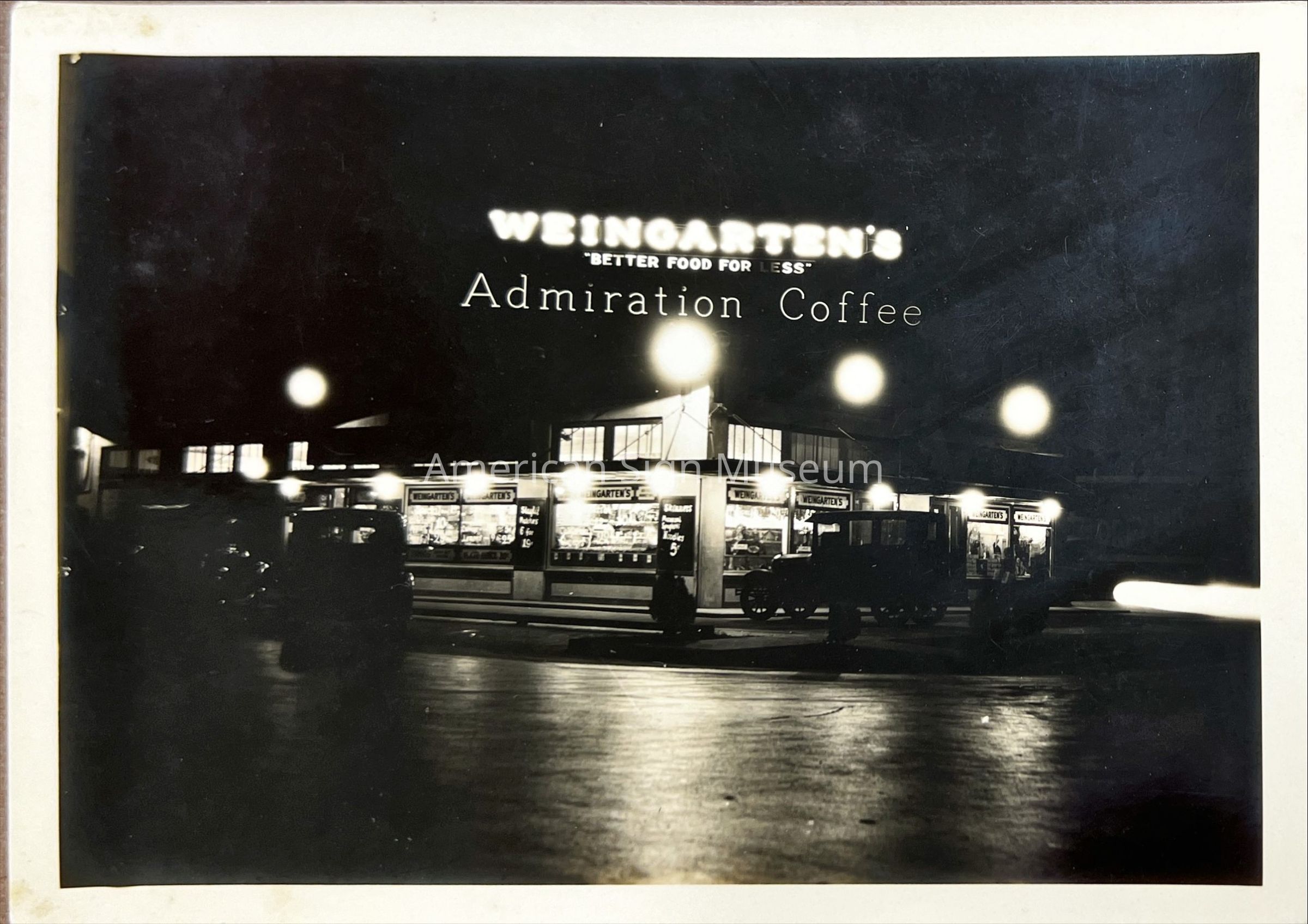 Photograph of early neon sign 1930-1940s - Weingarten's. Photo taken at night.