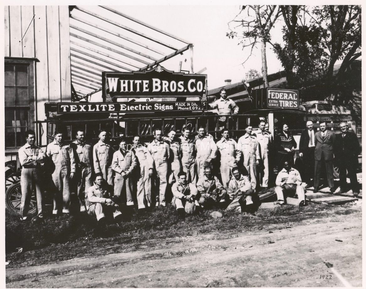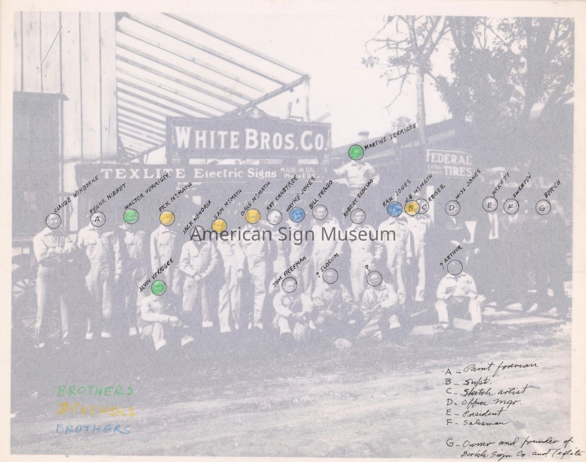 B&W photograph of signshop exterior with workers. White Bros. Co. - Texlite Electric Signs Tissue overlay identifies the people pictured.(See also 1999.0008.0041 for a smaller print of this image)Collection
