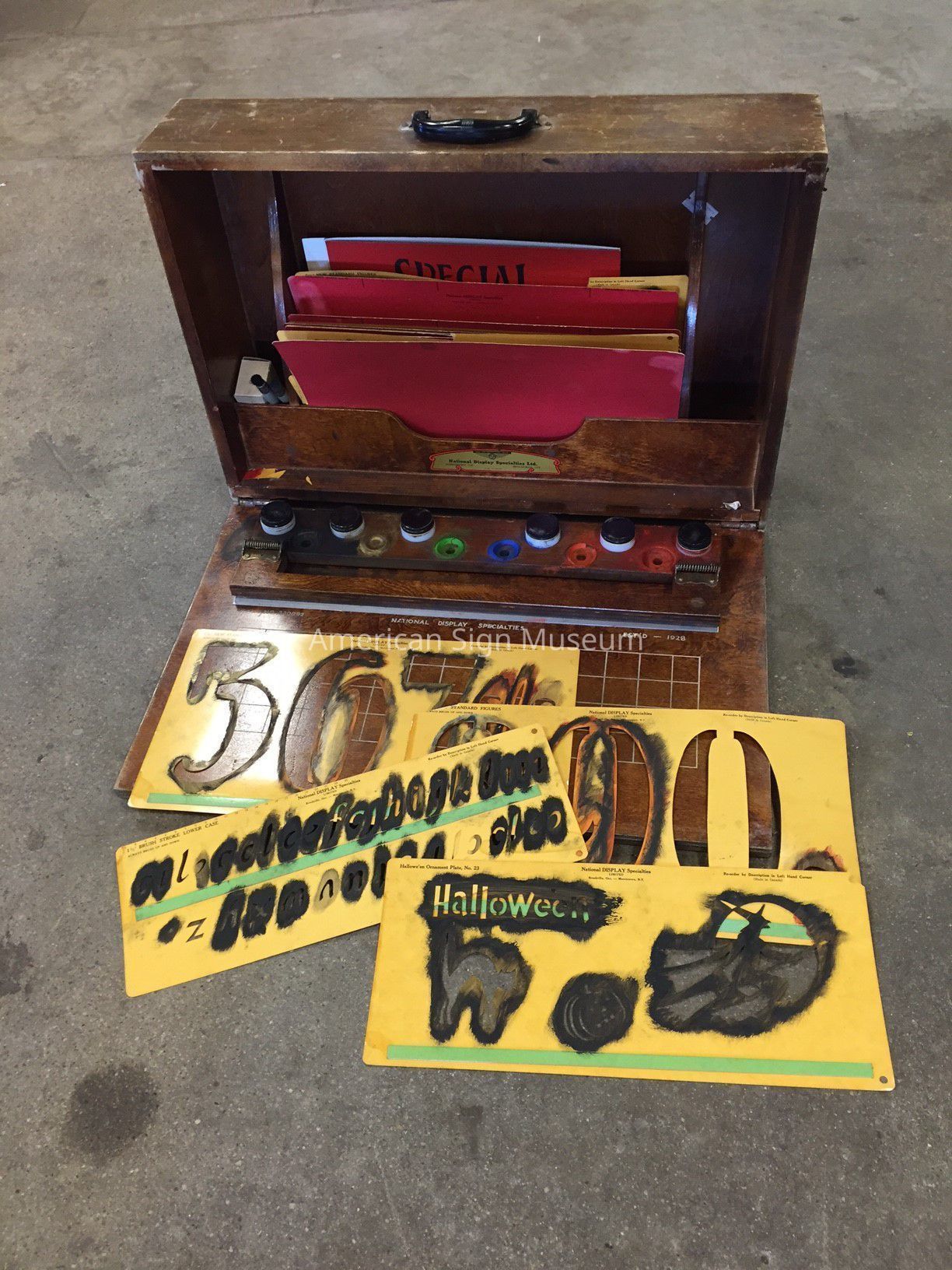 Showcard kit is wood box with divider and hinged, fold-down front. A wood bar is attached to fold-down front and houses six jars of poster colors. A hinged sawtoothed metal cutter is attached to paint bar for tearing off paper stock. Wood divider on inside of box holds cardboard dividers with various alphanumeric fonts and image templates as well as blank cardboard stock. Also included are two brushes with bristles at each end and a box of extra poster color bars.Collection