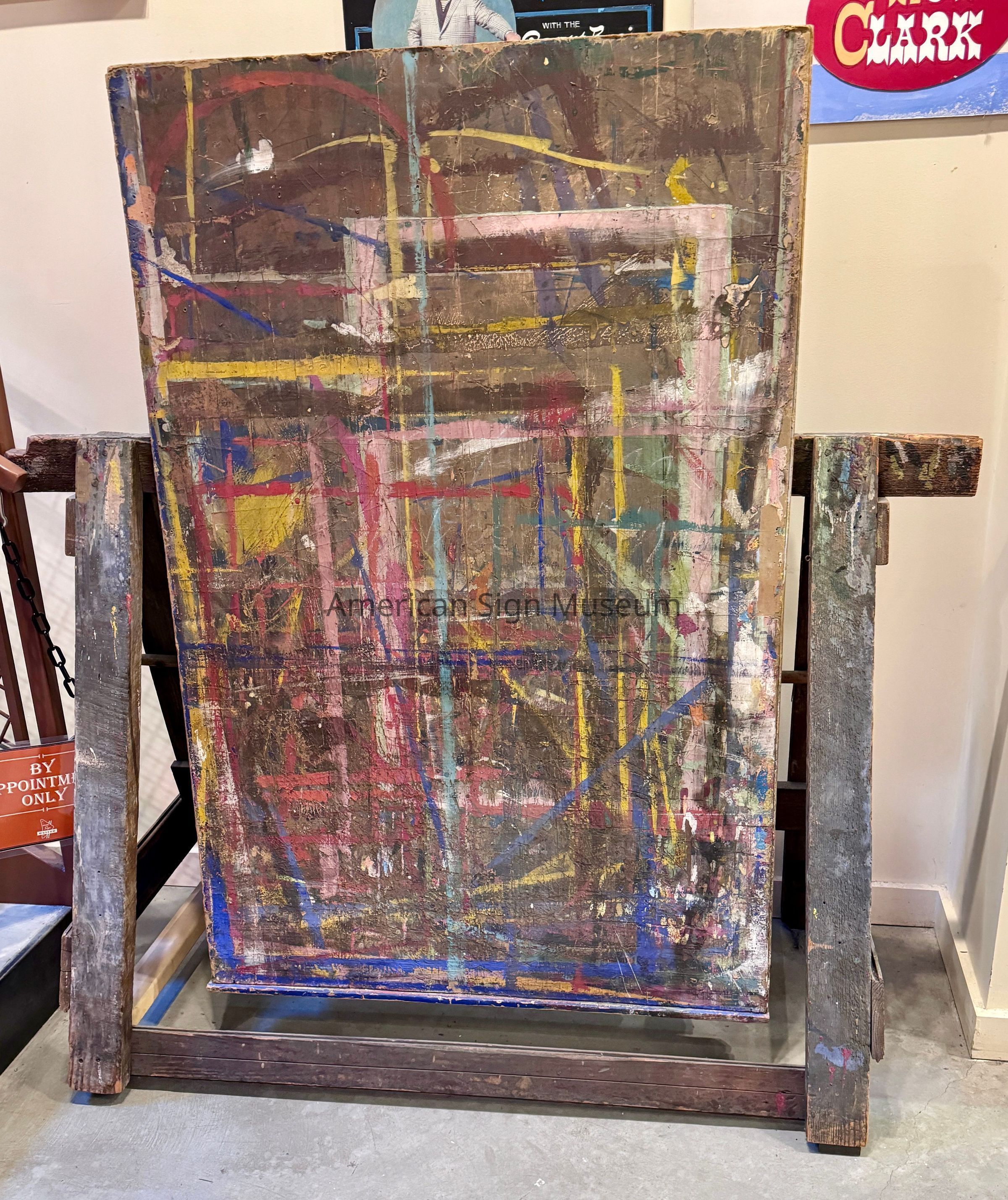 The well-worn, hand-made bench was found on the second floor of a former theater in Pittsburgh, PA. The “table” portion of the adjustable easel was made from a discarded, hand-lettered Christmas-themed display, visible on the underside of the panel. Many of the larger theaters had full-time, in-house signpainters to design and create the various promotional displays needed to promote the changing slate of movies.Collection