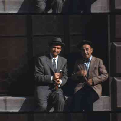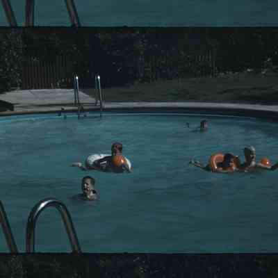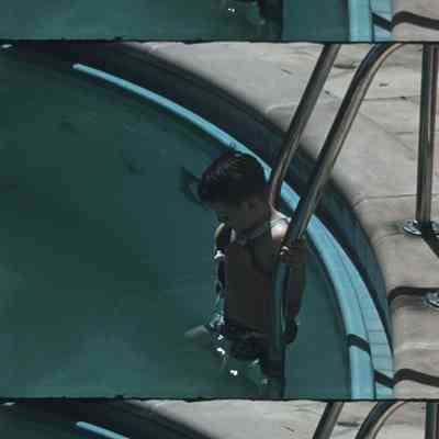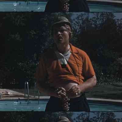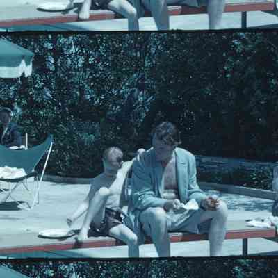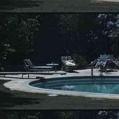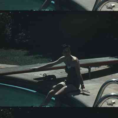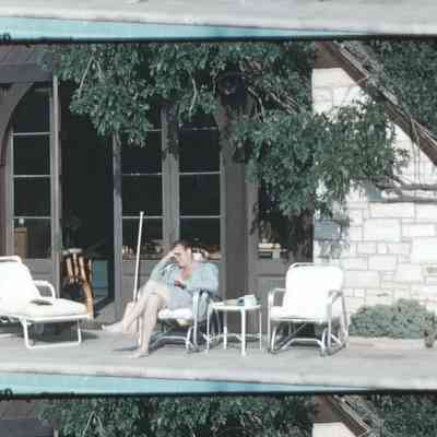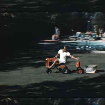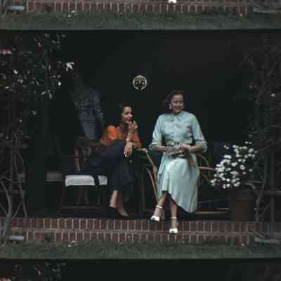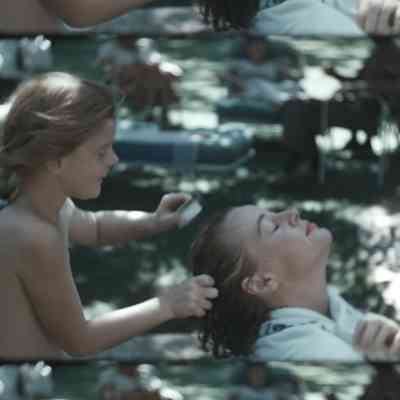 girl washing her mother's hair with a garden hose in the backyard while she smokes a cigarette