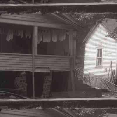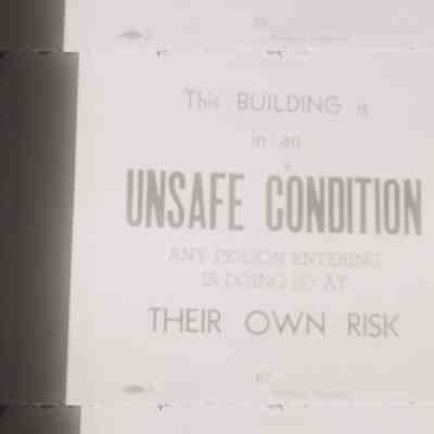 sign reading: Warning This Building is in an Unsafe Condition. Any Person Entering is Doing so at their own risk.