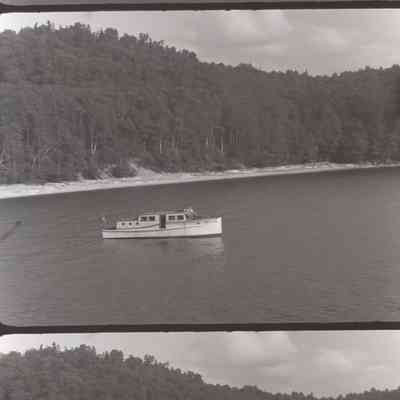 boat floating in the water with rolling hills in the background