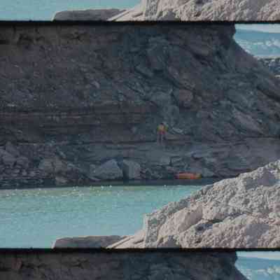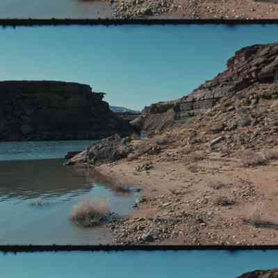 Louis Knobbe Collection Lake Powell 1974 Red Canyon kids rowing a row boat on the lake kids swimming in the lake and climbing along the cliffs near the water