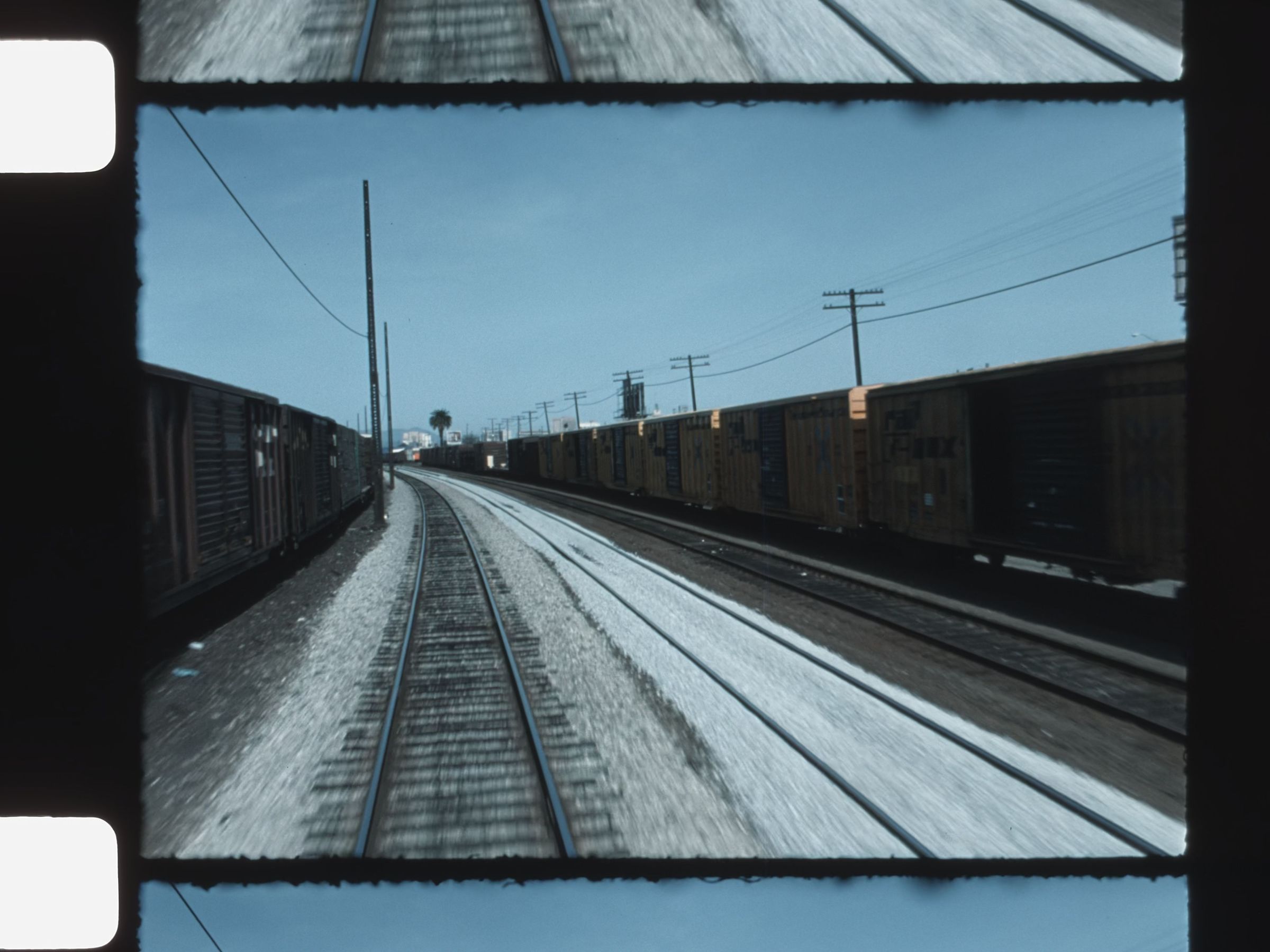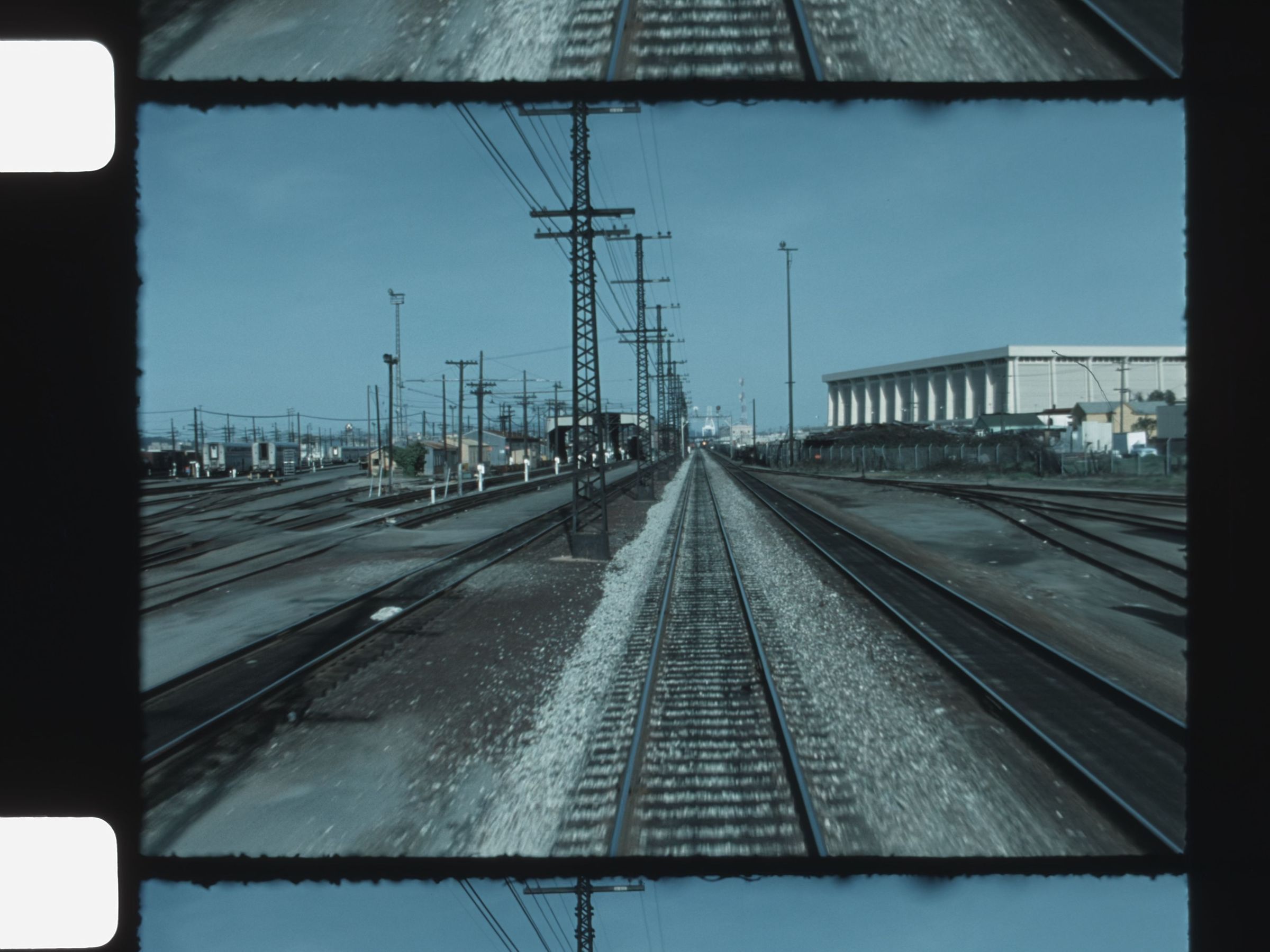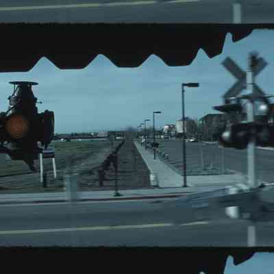 view of businesses and town from train passing byMotion Picture Details