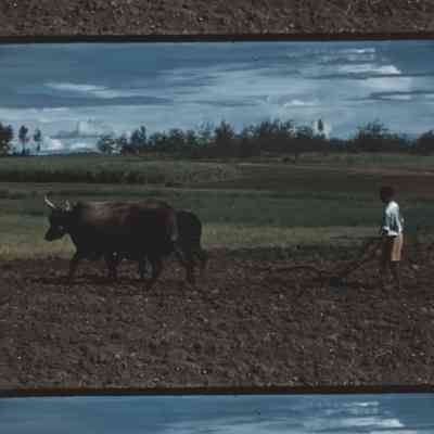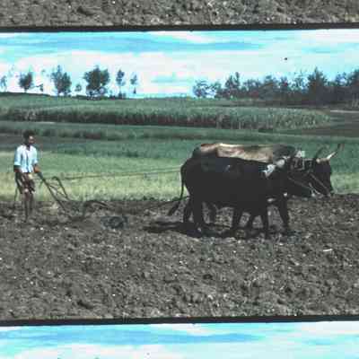 a man plows a field with two oxen