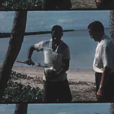 a man cutting open a coconut