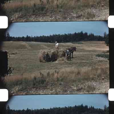 Farmers gathering hay with horse drawn wagon