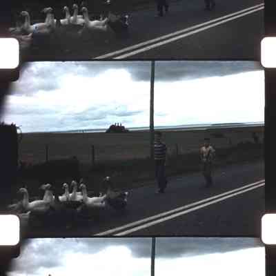 cows and geese walking on road