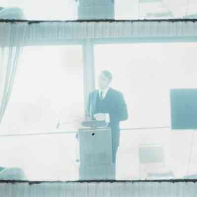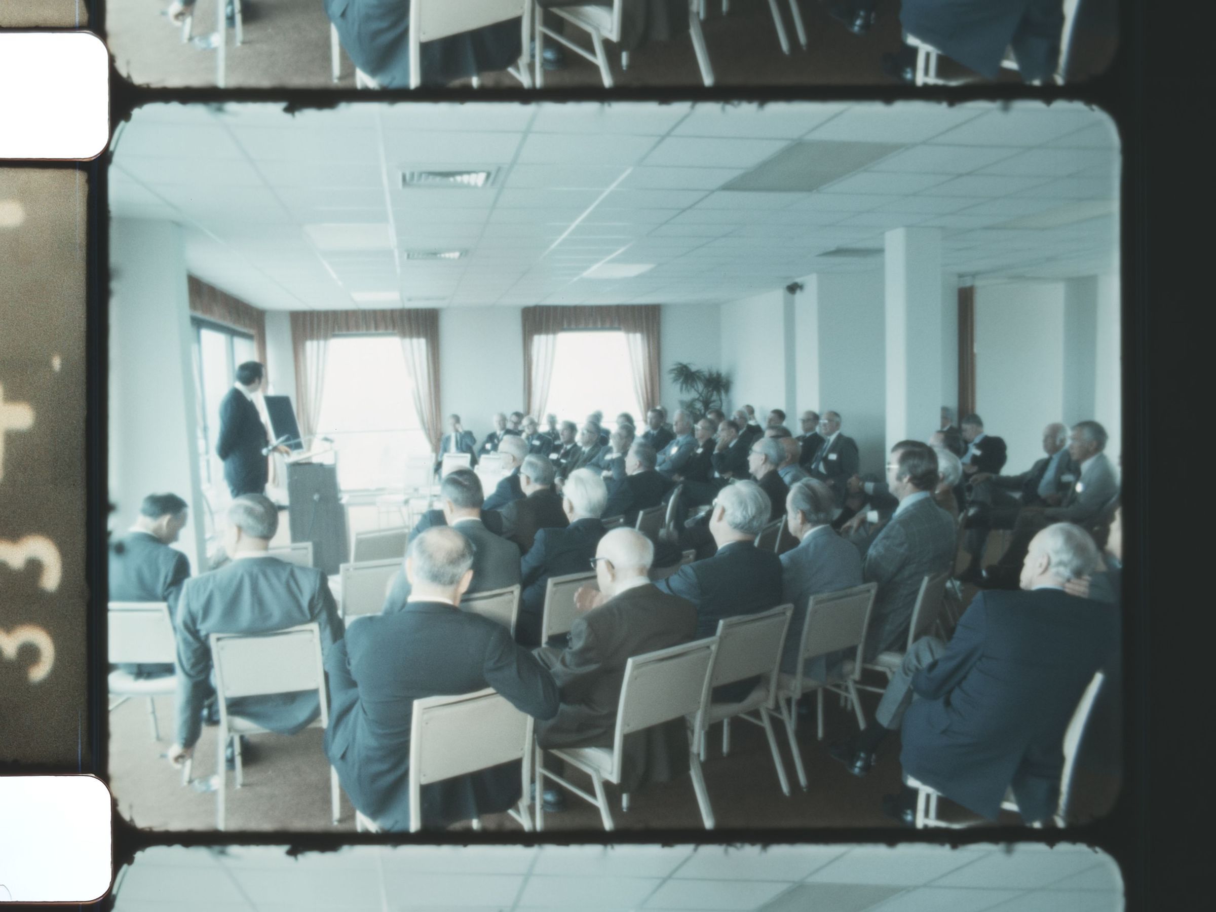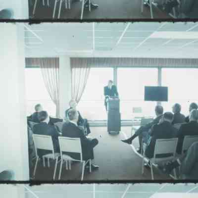 men gathered around a speaker in a large room a man speaking to a crowd men listening intently to a public speaker