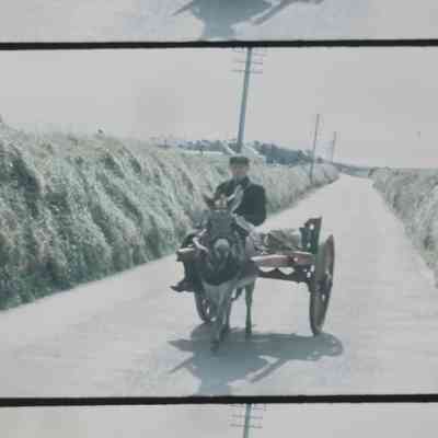 a donkey pulls a cart on a country road
