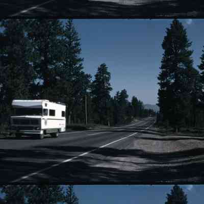 cars driving down road lined with pine trees