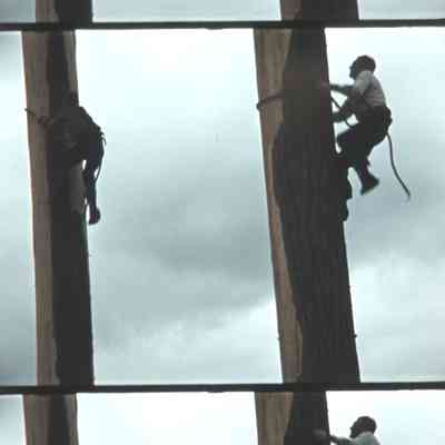 men climbing poles