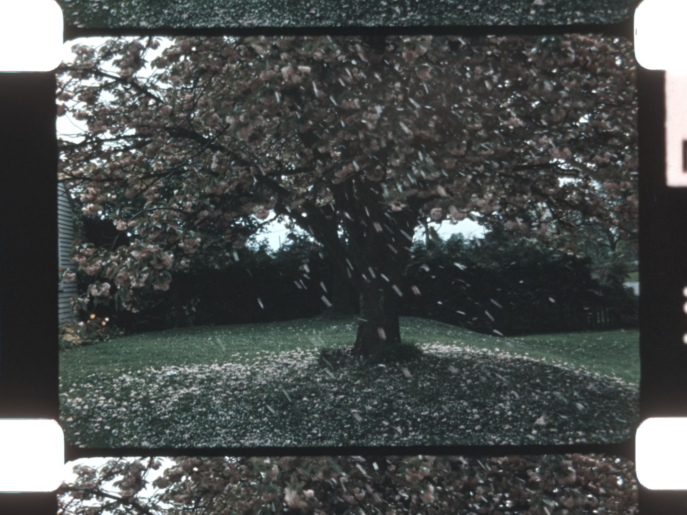 06:10–07:00 — Cherry blossom and dogwood trees near white picket fence.