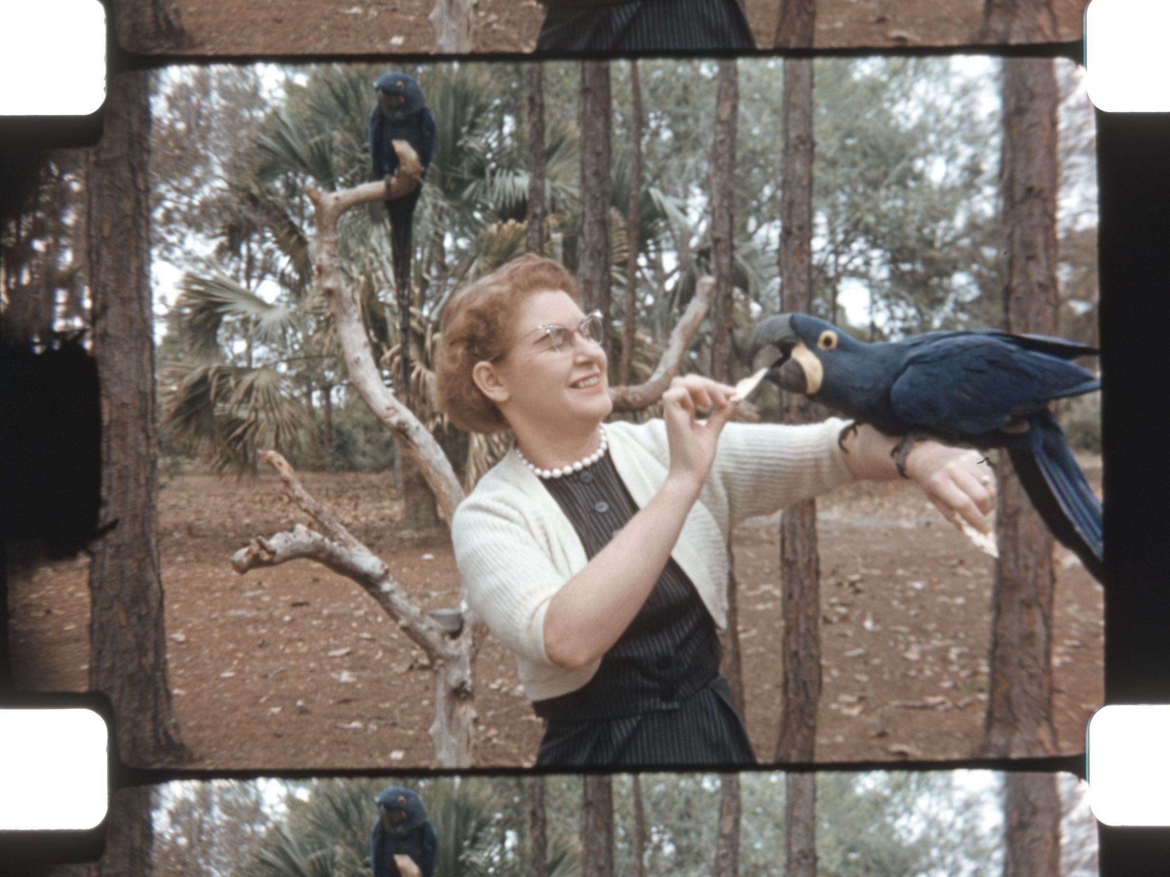 woman feeding parrots