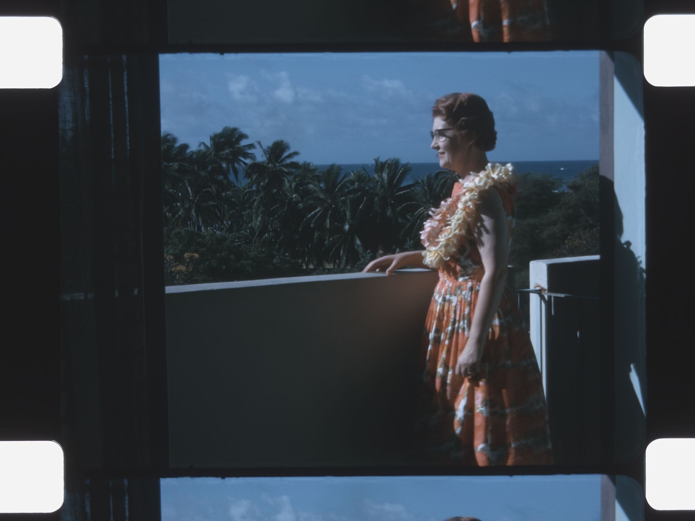 a woman walks out on a balcony and gazes into the distance where palm trees sway