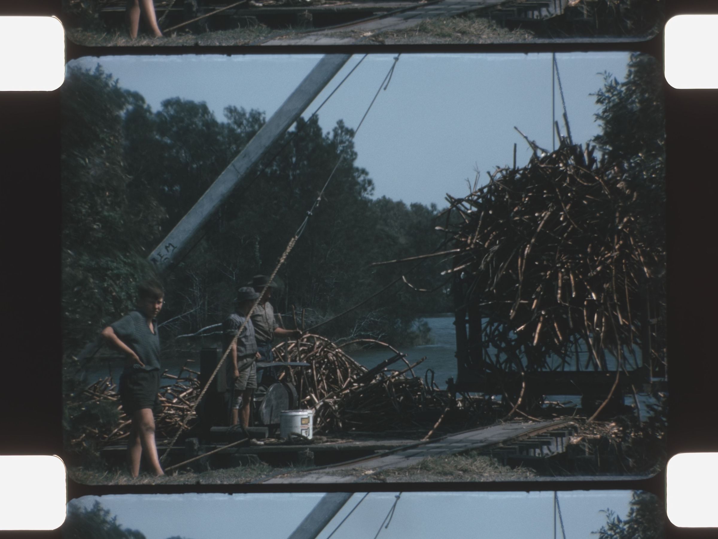 sticks being collected and stored on a barge