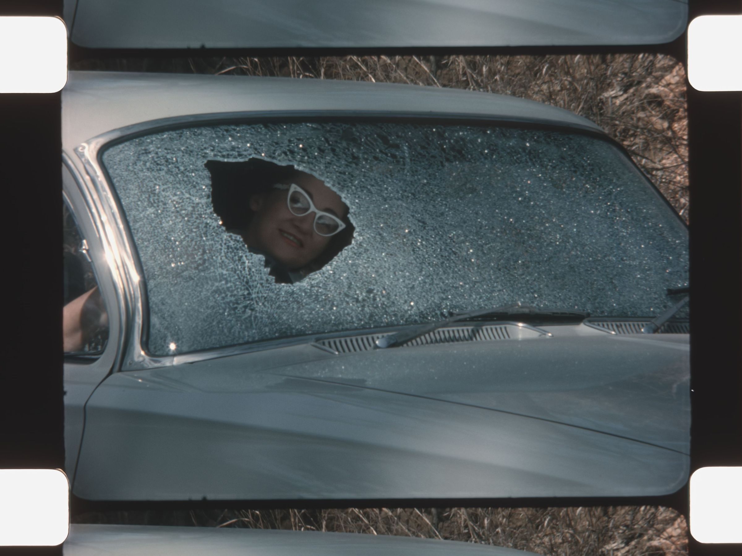 a woman smiles through a hole in a car windshield