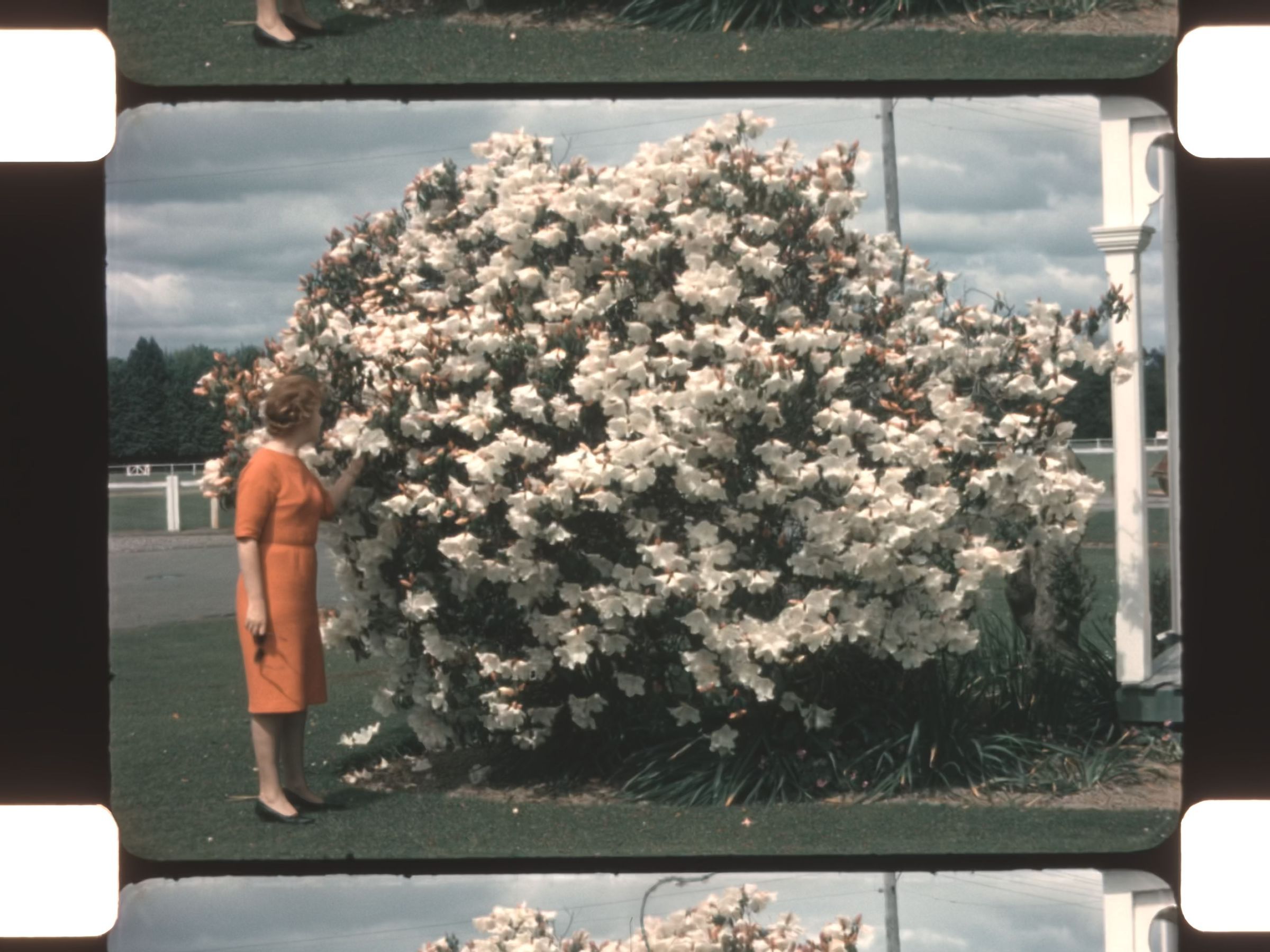 woman smelling flowers on a large bush