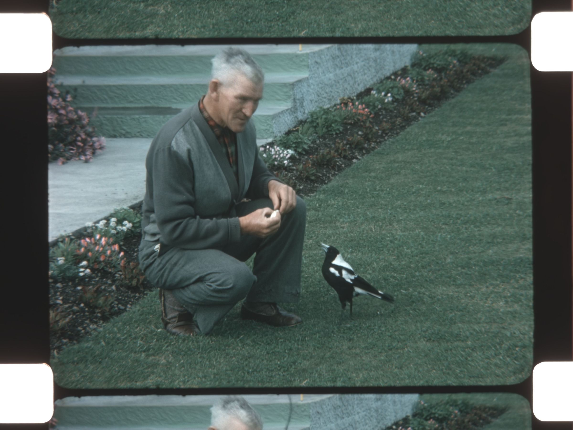 a man feeding a magpie