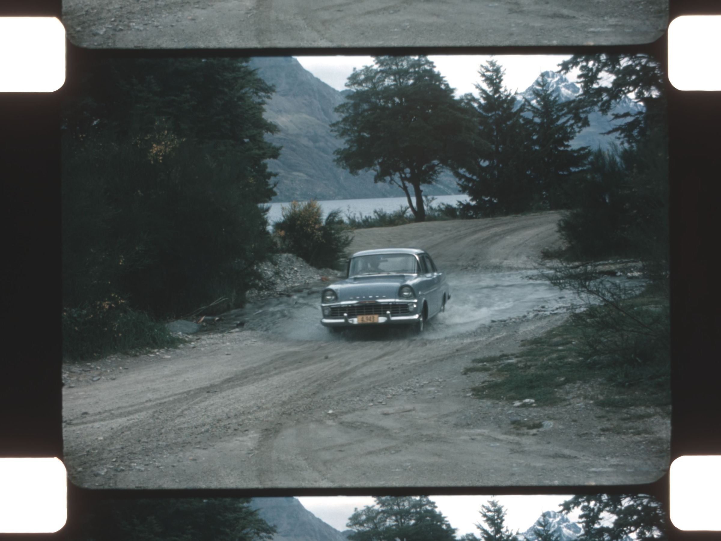 a car driving down a mountain road through a low water crossing