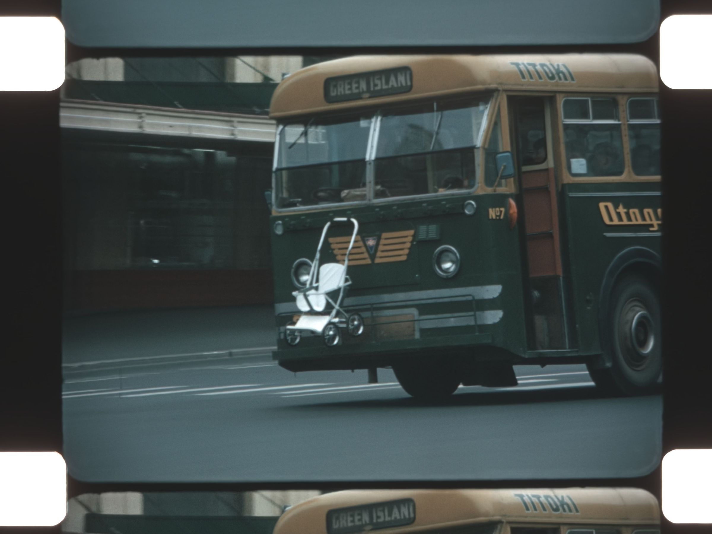 buses hauling baby carriages on the fronts and backs