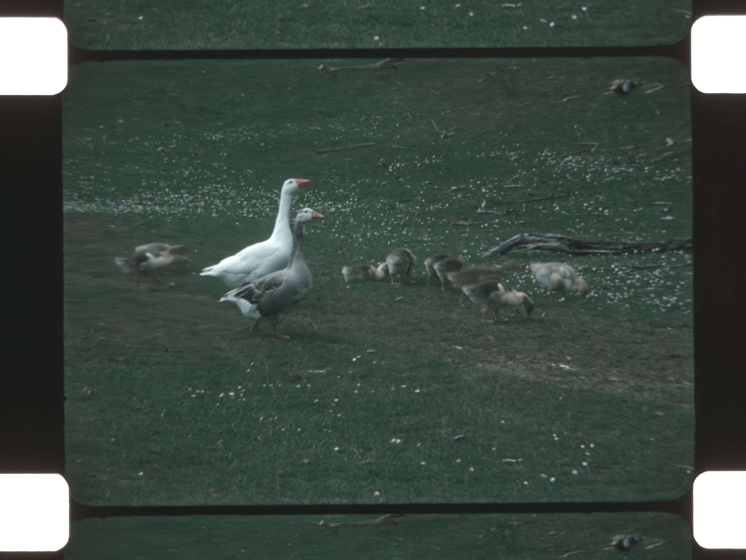 a goose family in a field