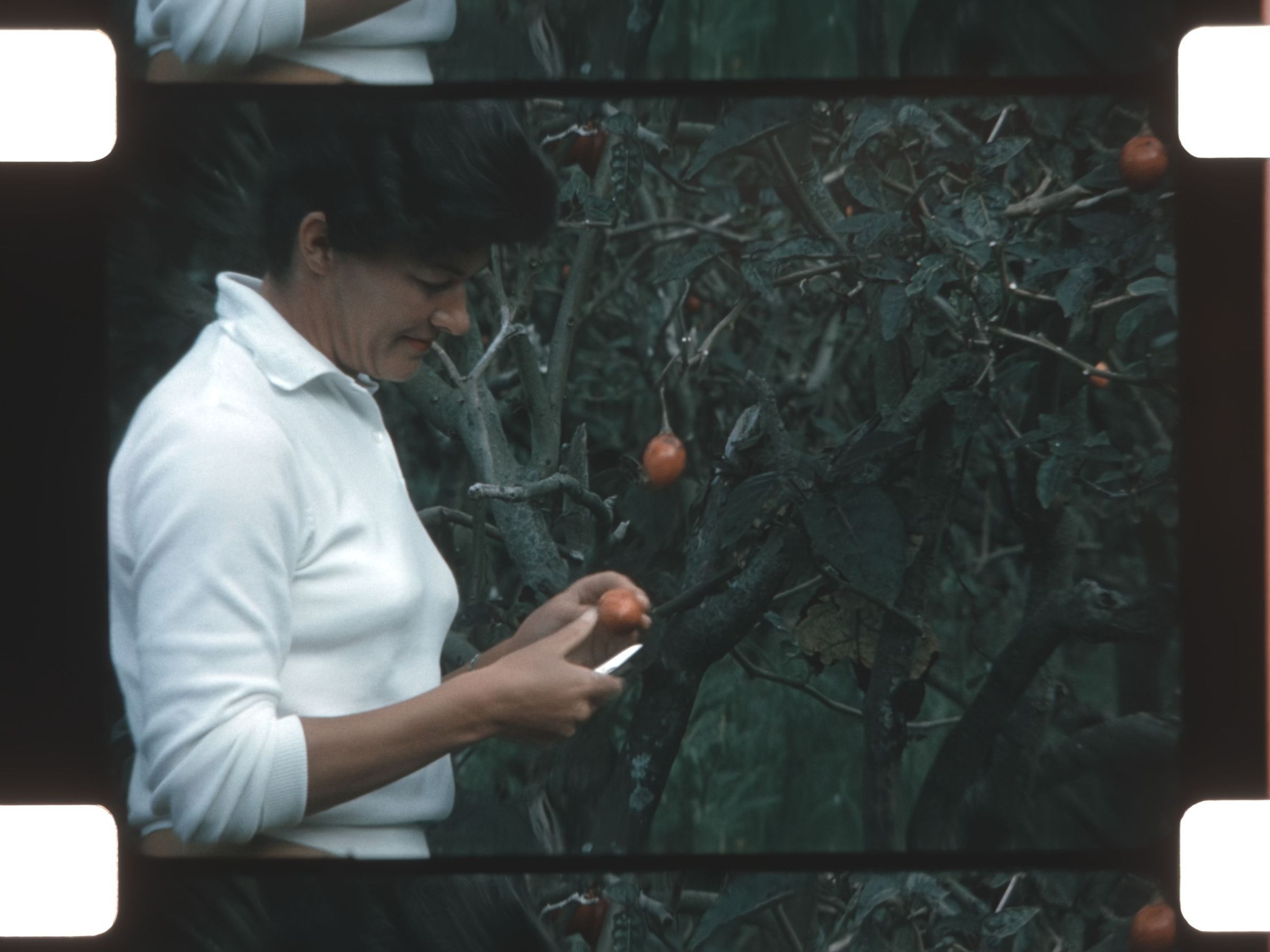 woman picking and cutting a fruit from a tree