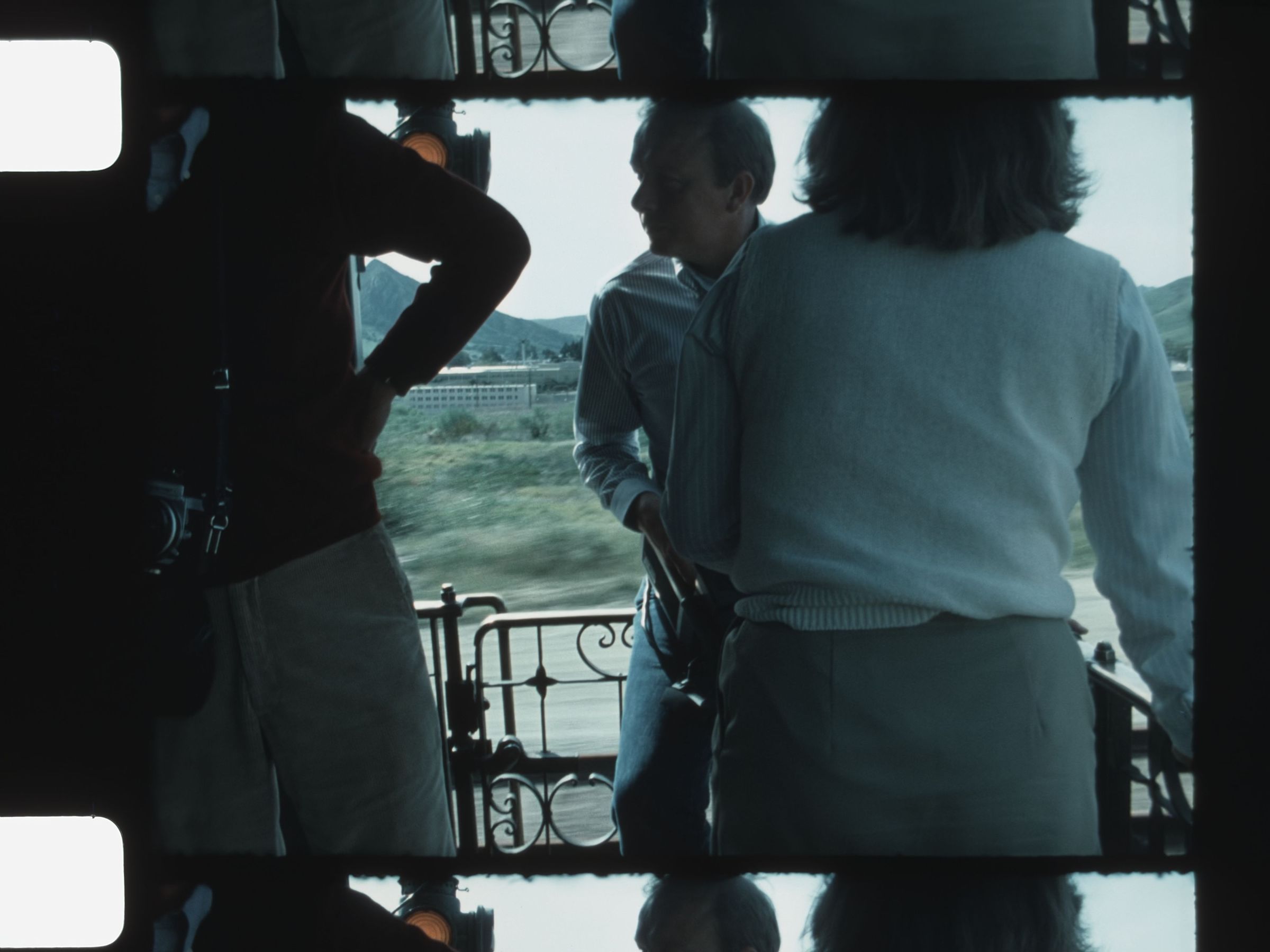 people standing on the back of a train smoking