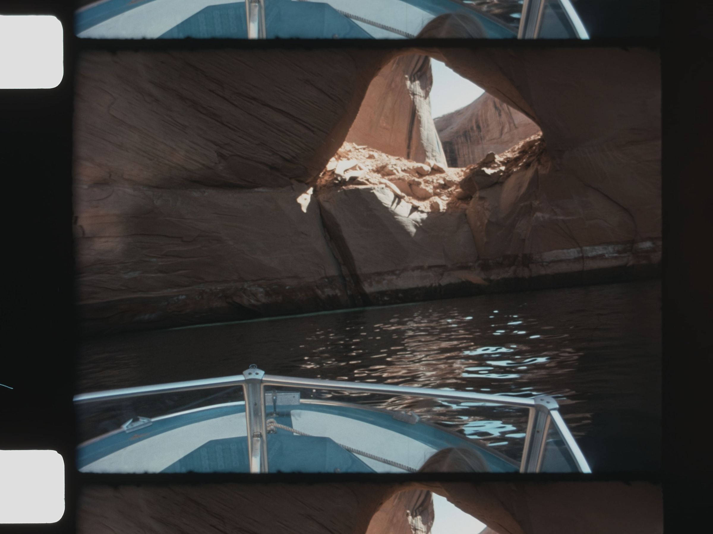 Louis Knobbe Collection Davis Gulch on Lake Powell in 1974 boating on Lake Powell views while boating near a canyon
