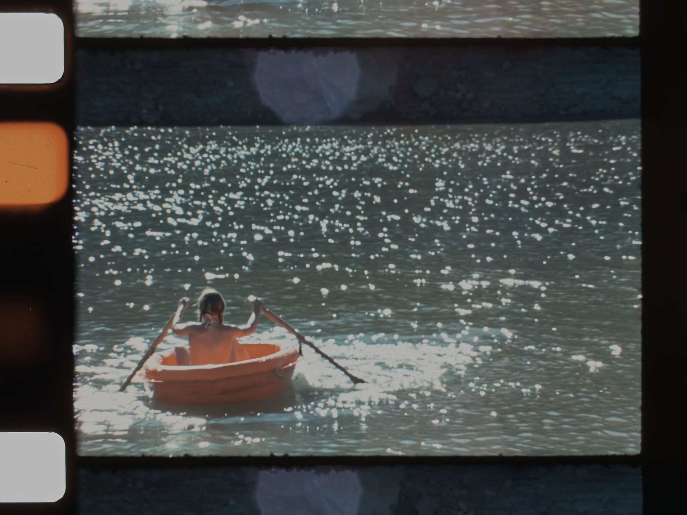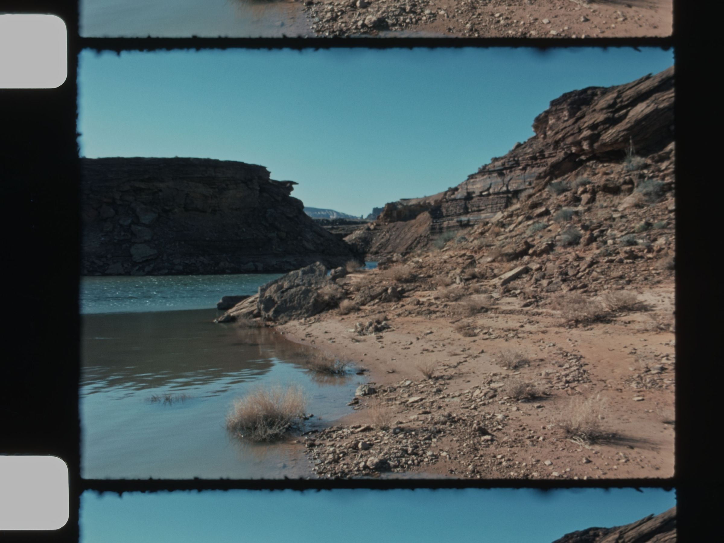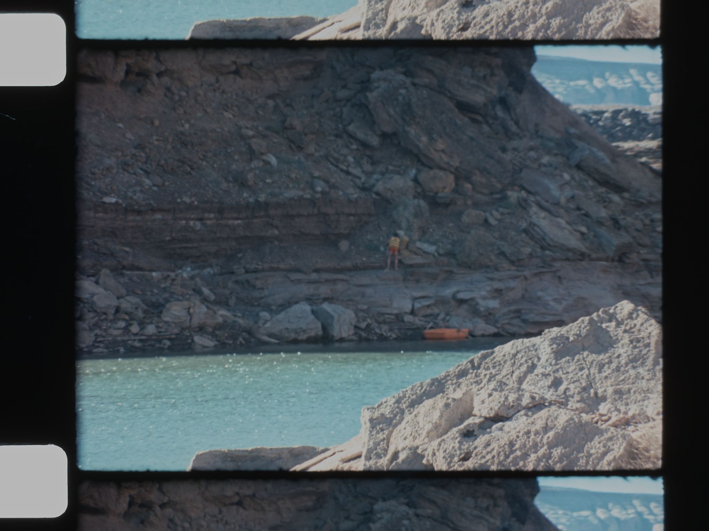 Louis Knobbe Collection Lake Powell 1974 Red Canyon kids rowing a row boat on the lake kids swimming in the lake and climbing along the cliffs near the water
