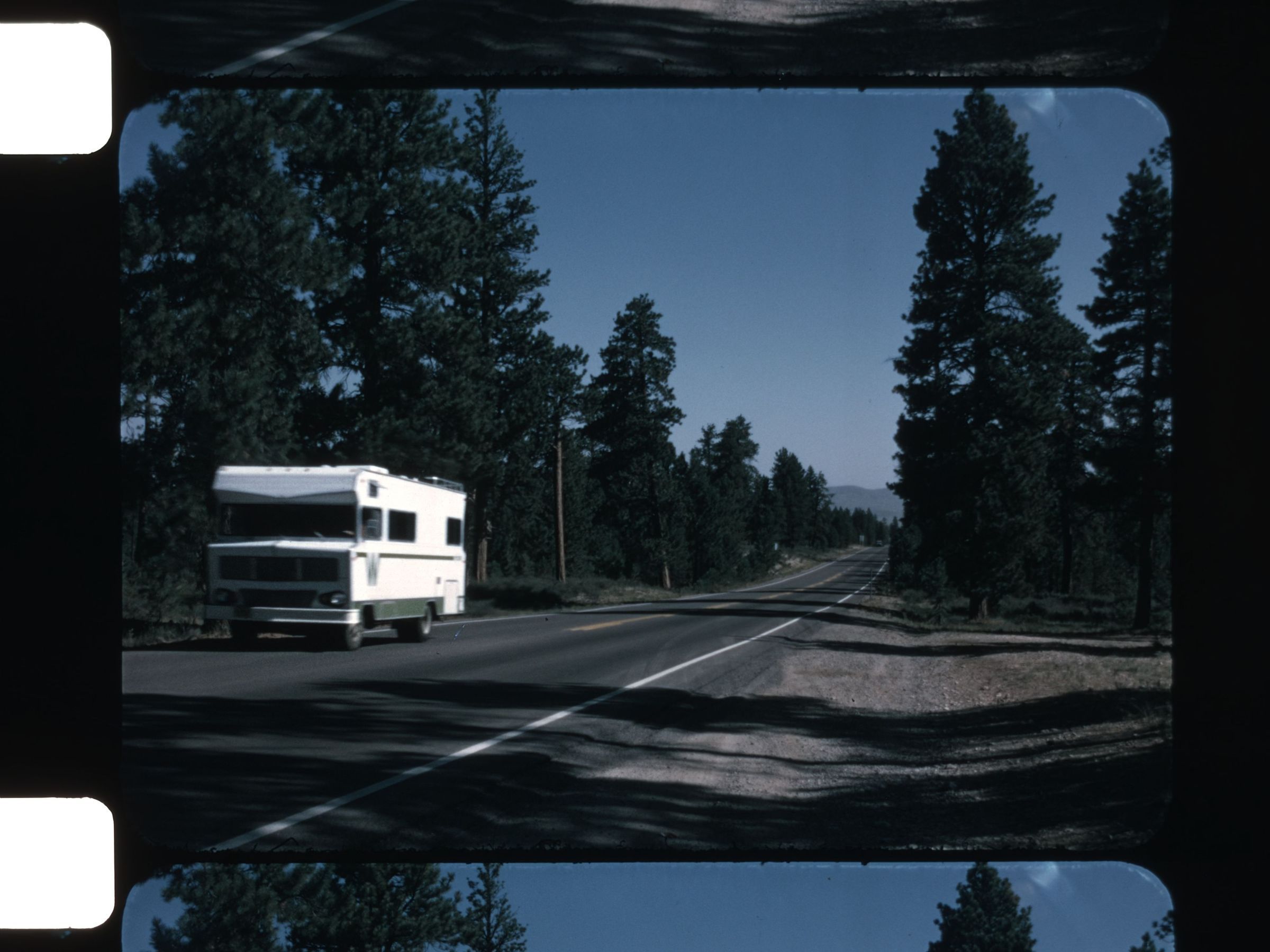 cars driving down road lined with pine trees
