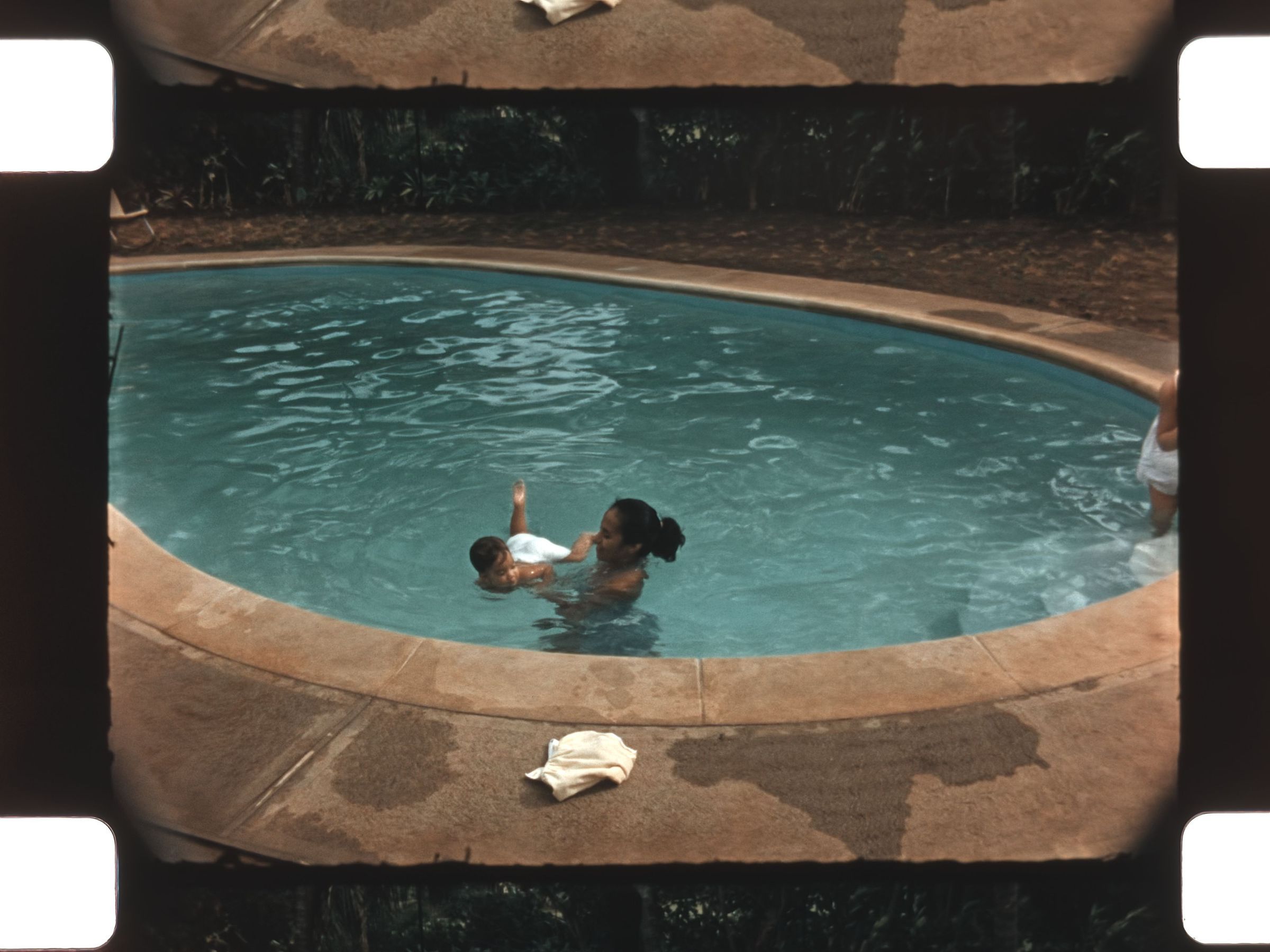 woman and child swimming in a backyard pool a ta midcentury modern house