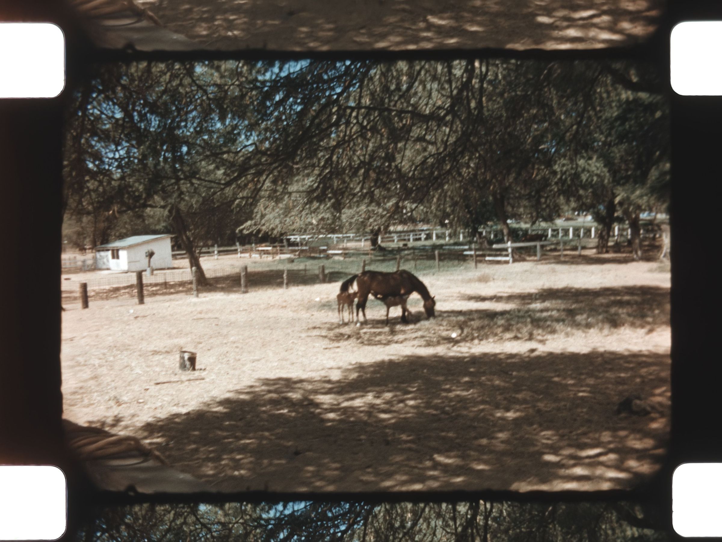 scenes of horses near their stalls and in the shade
