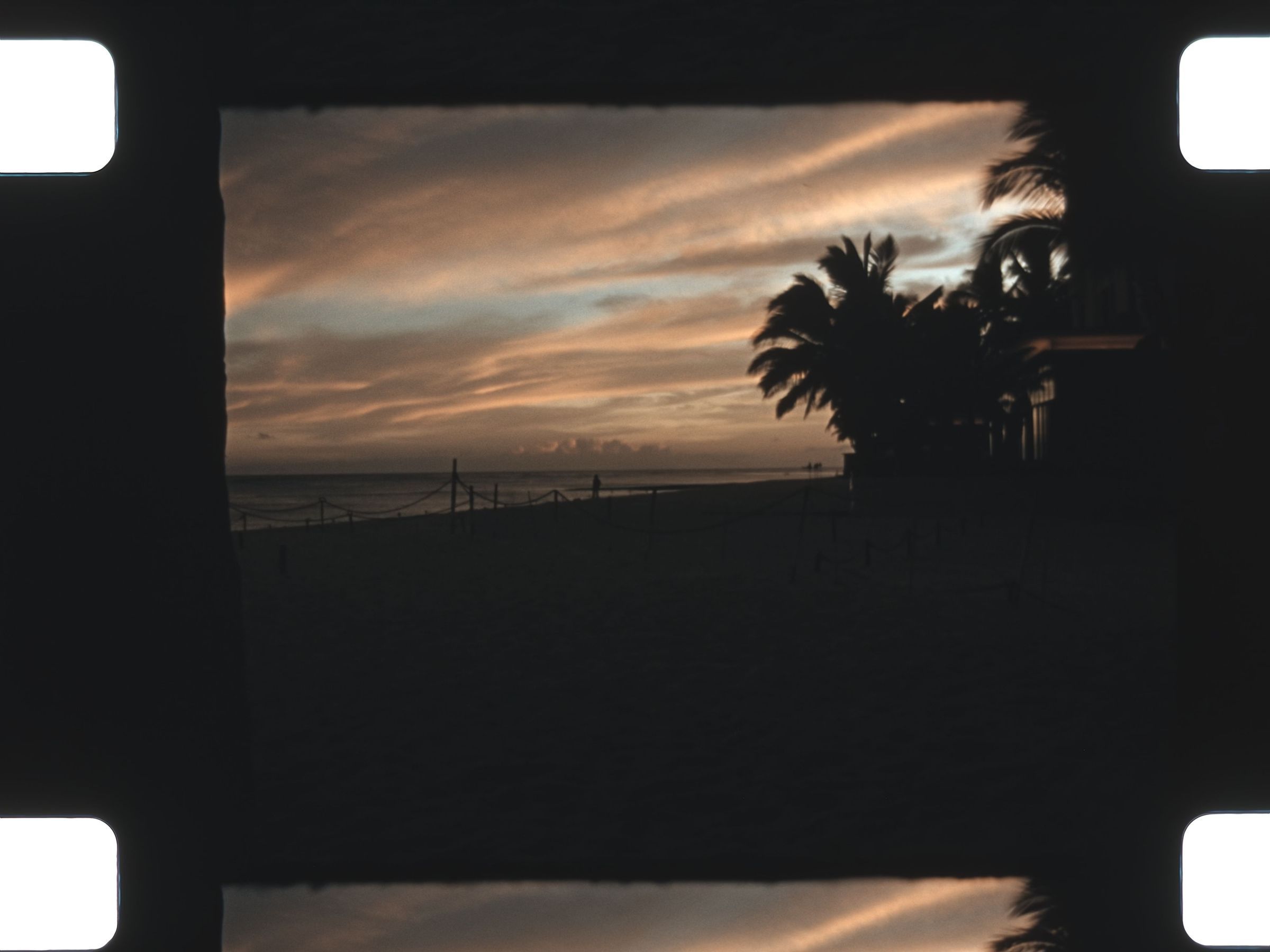 sunset on the beach as the palm trees blow in the wind