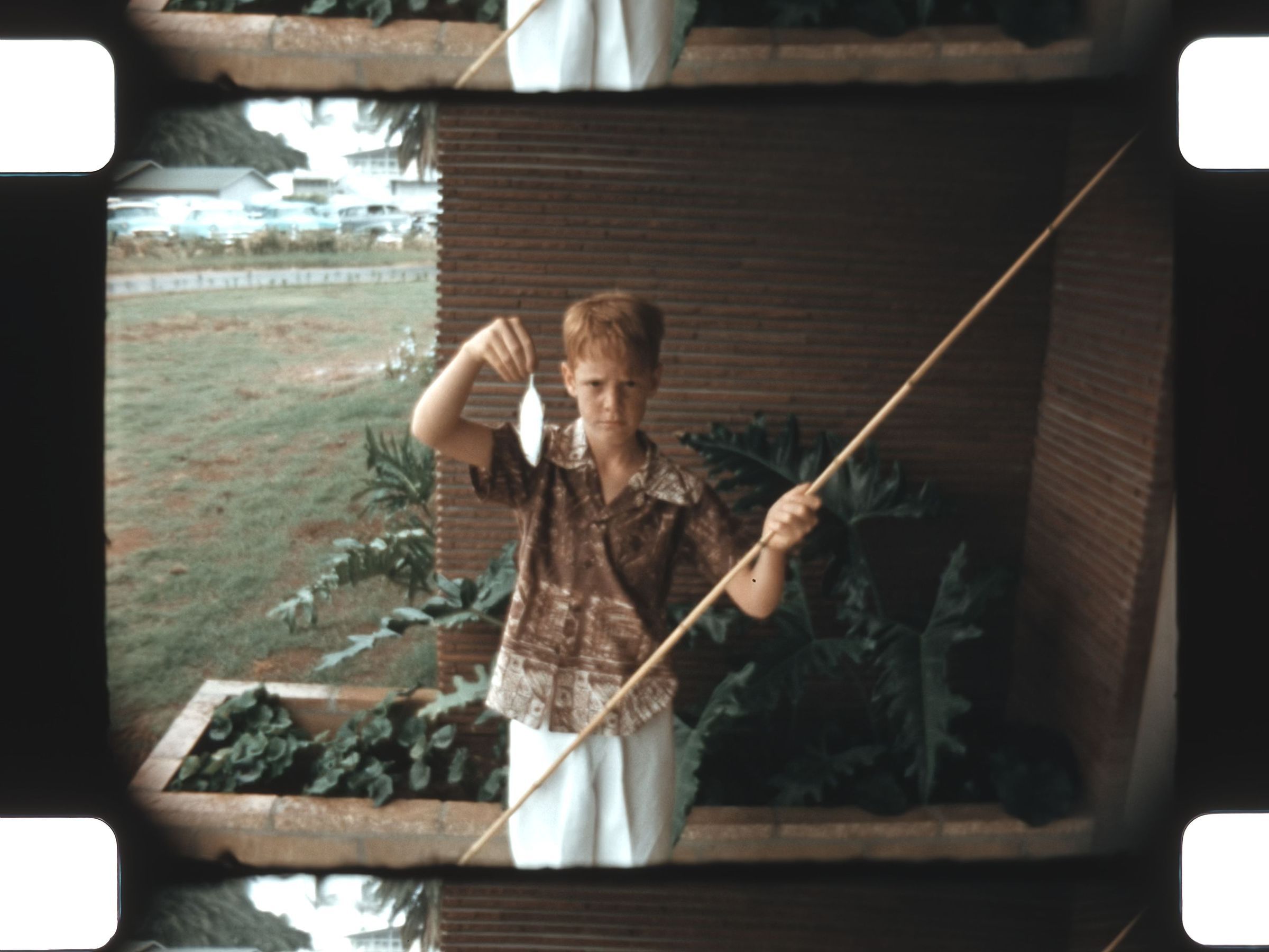 boy holding fish and cane fishing pole