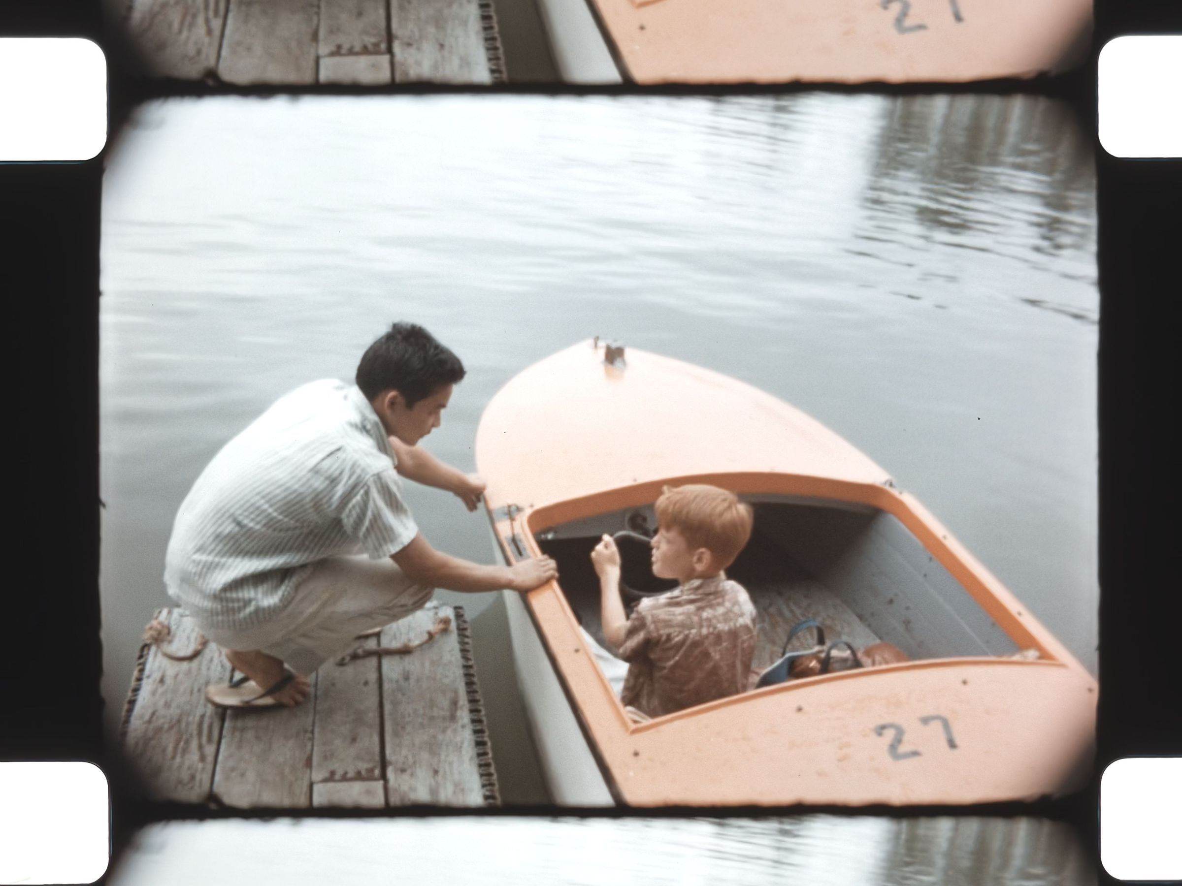 boy and man out boating as man smokes a cigar