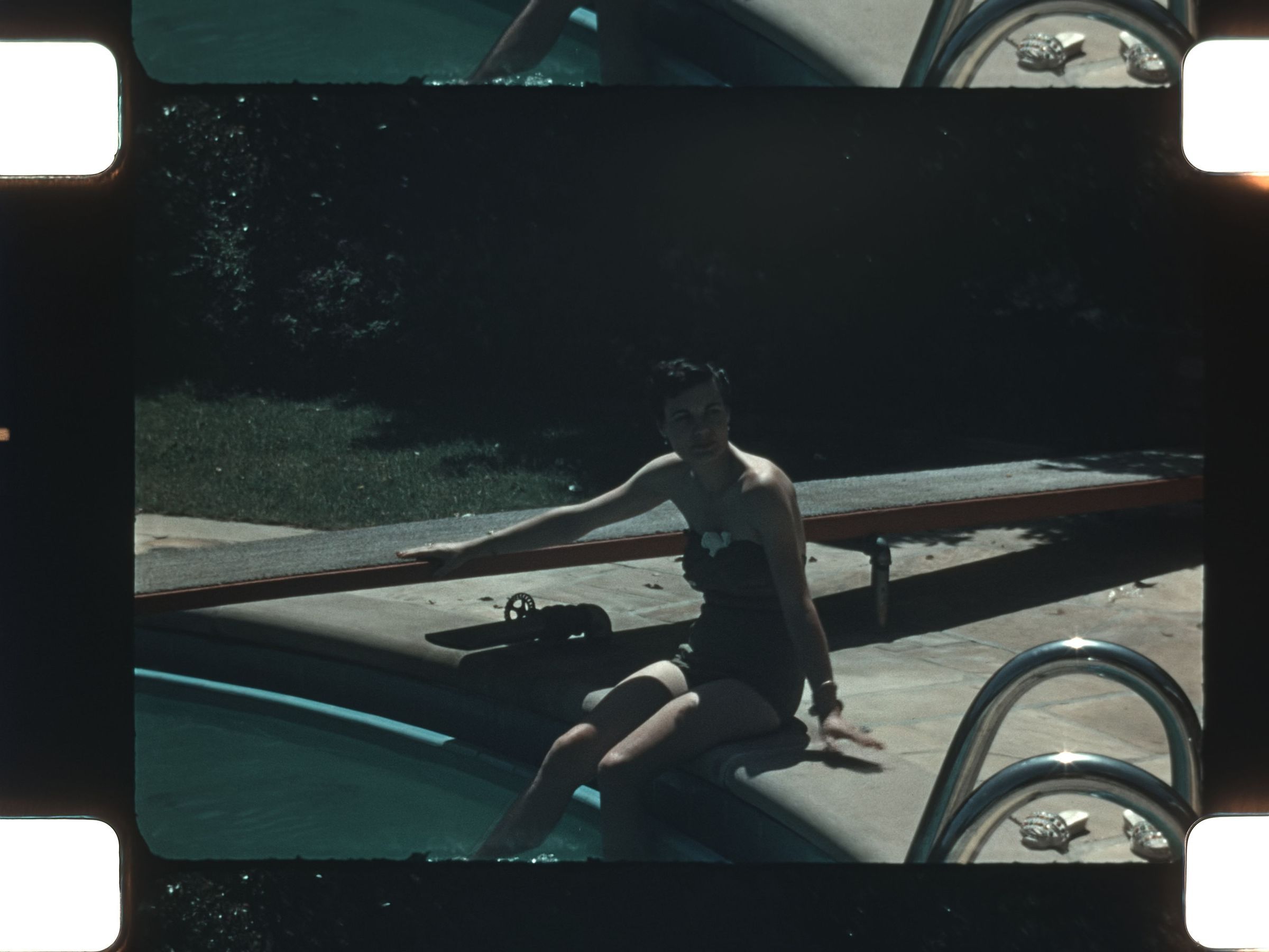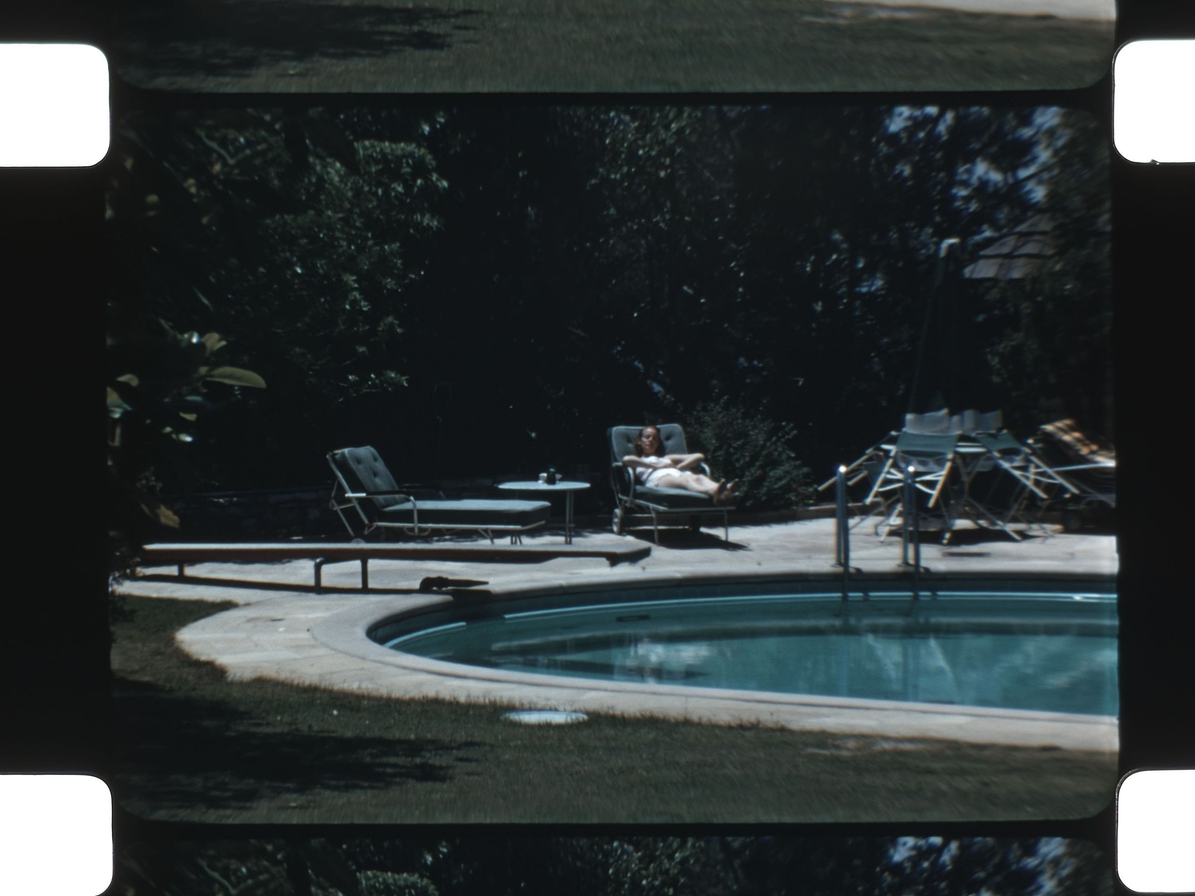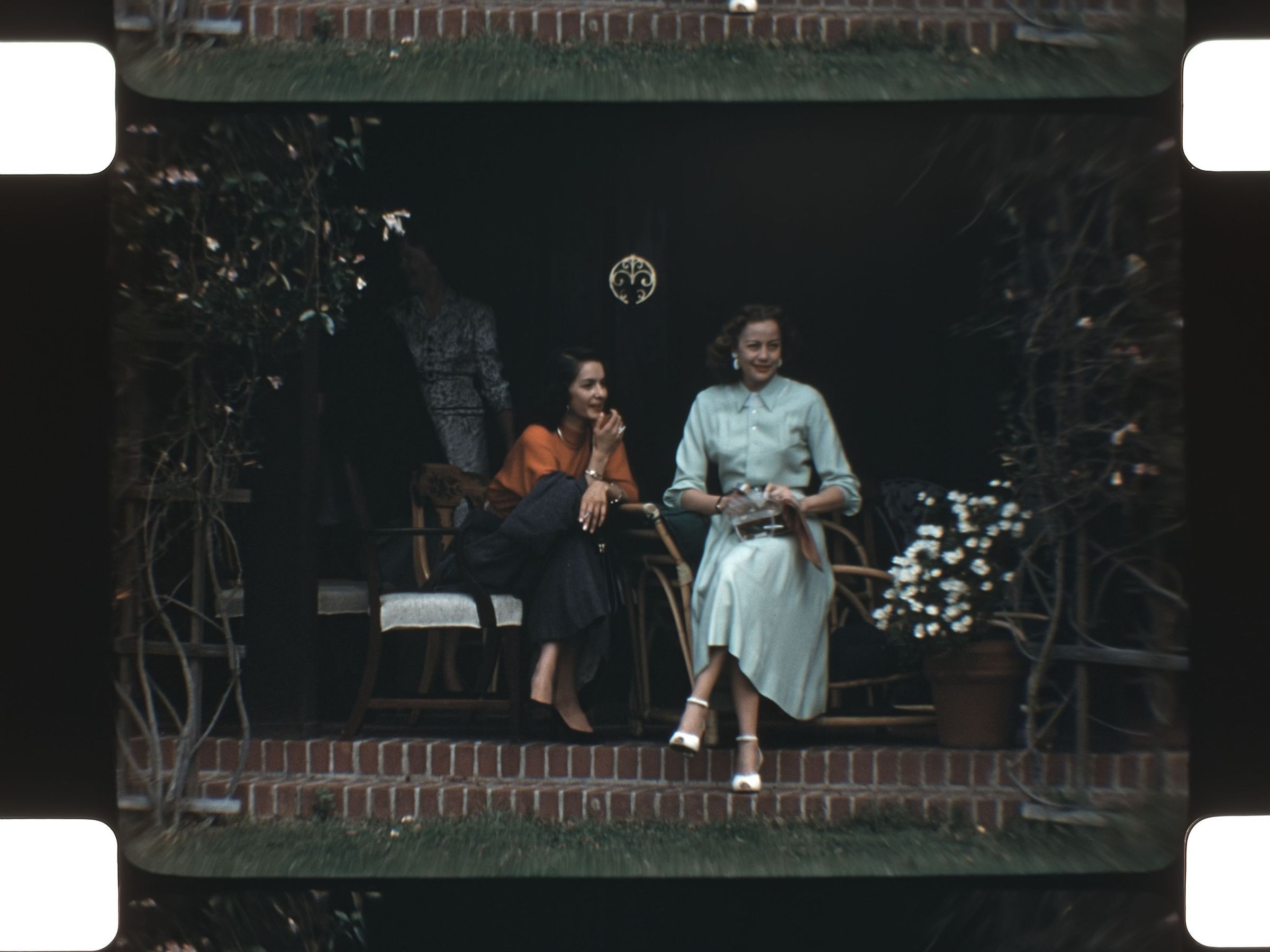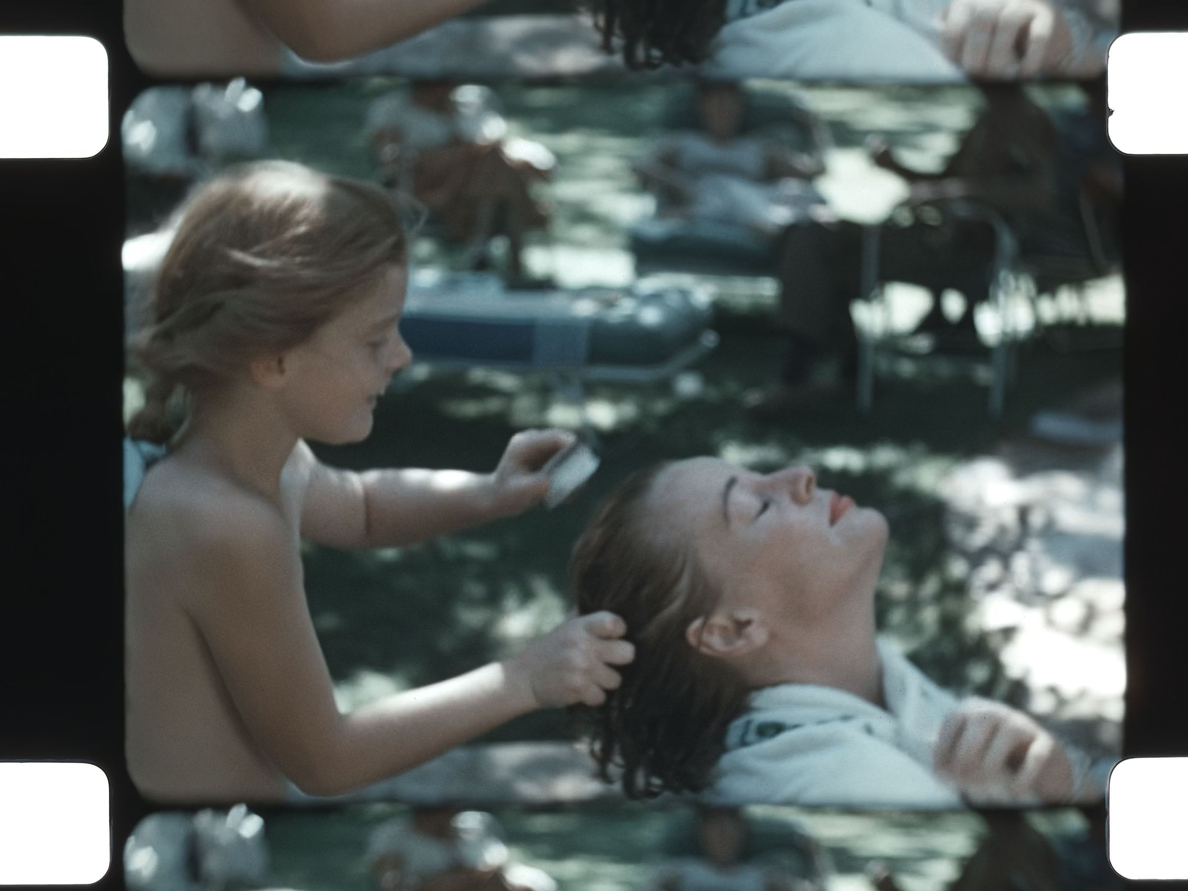girl washing her mother's hair with a garden hose in the backyard while she smokes a cigarette