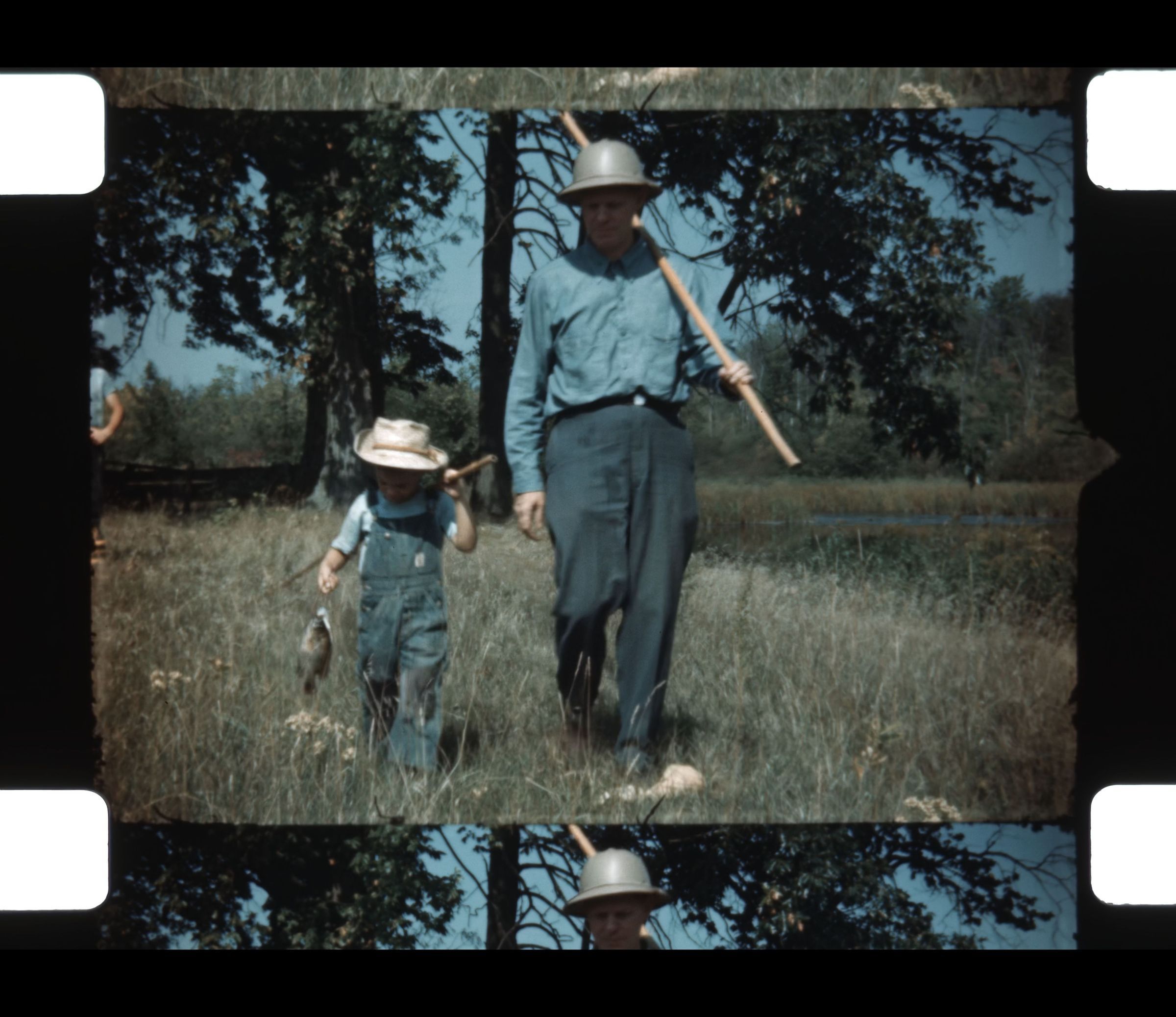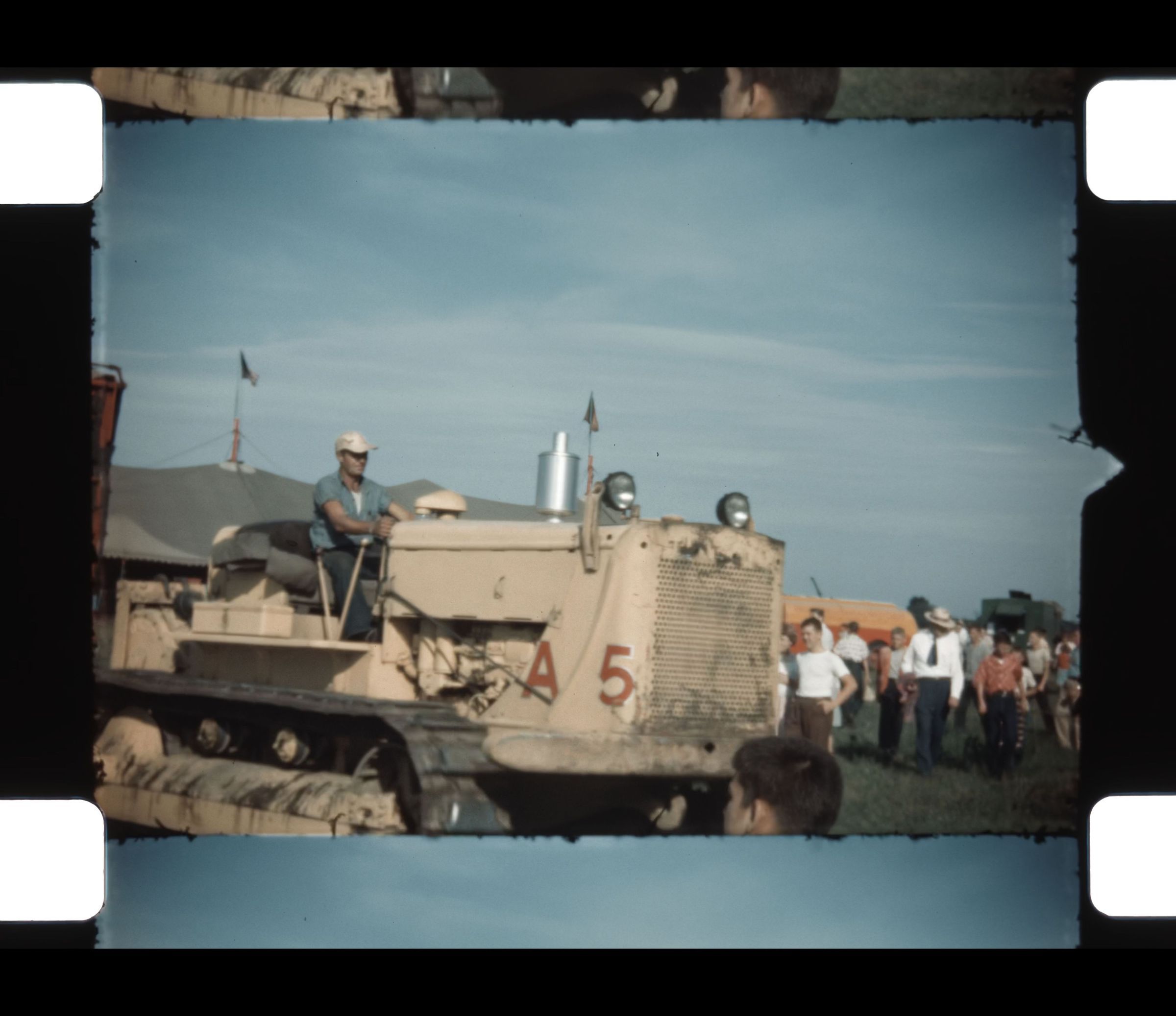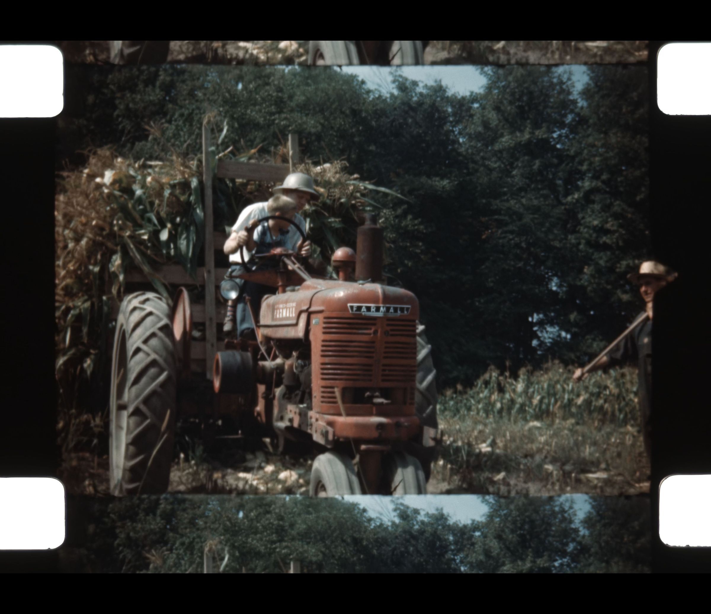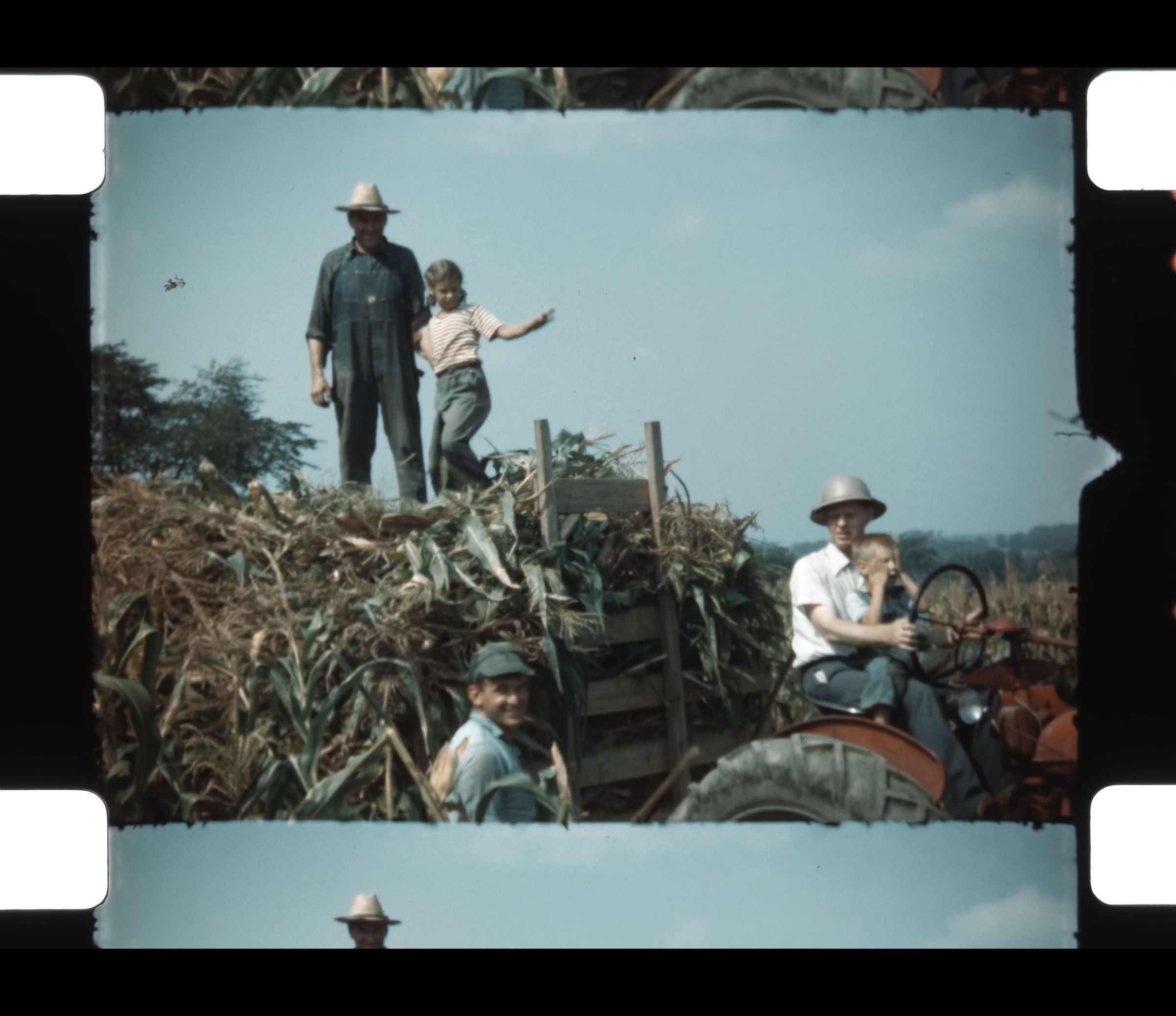 farmers driving tractors and shoveling corn stalks onto the back of a tractor