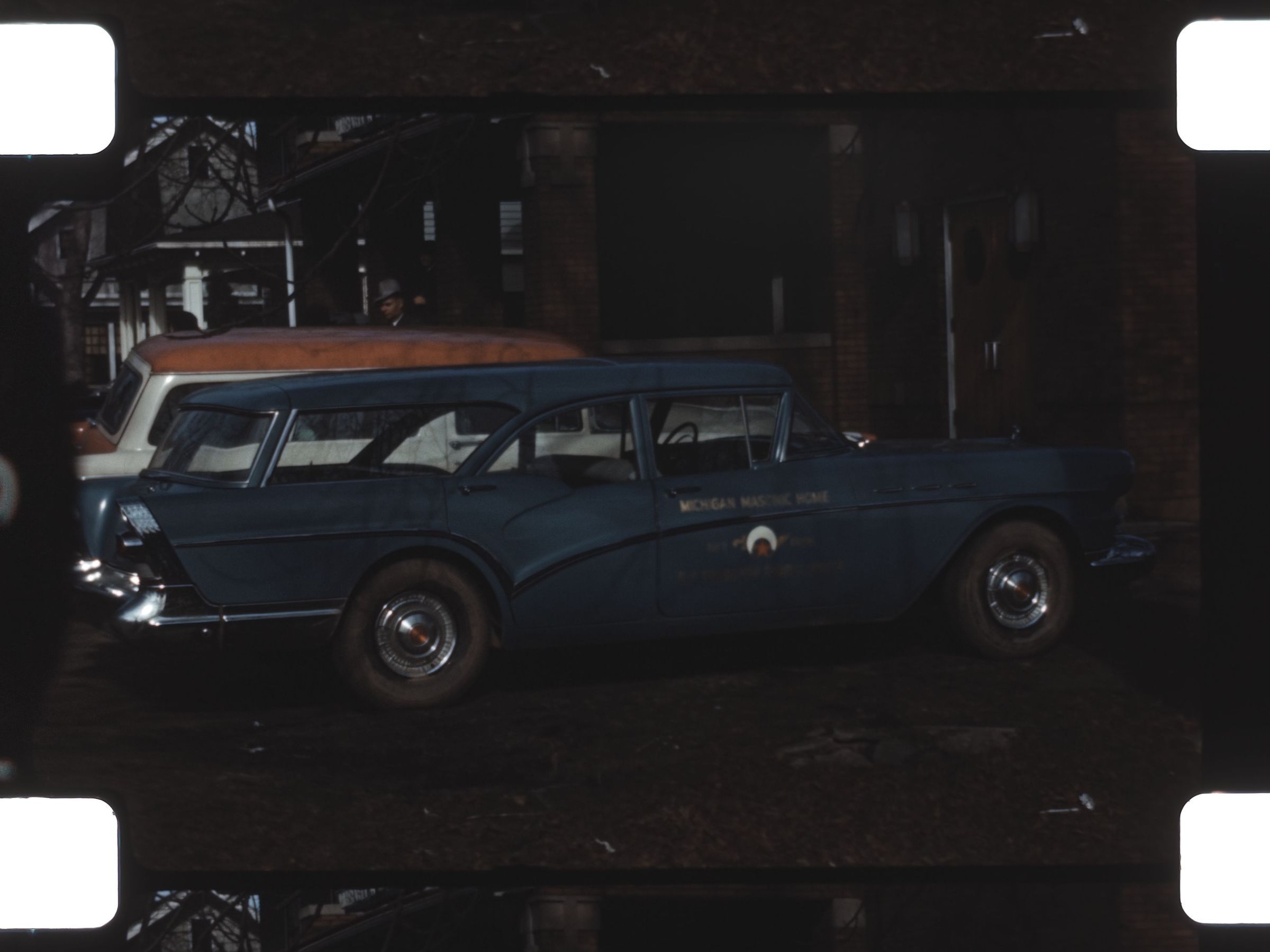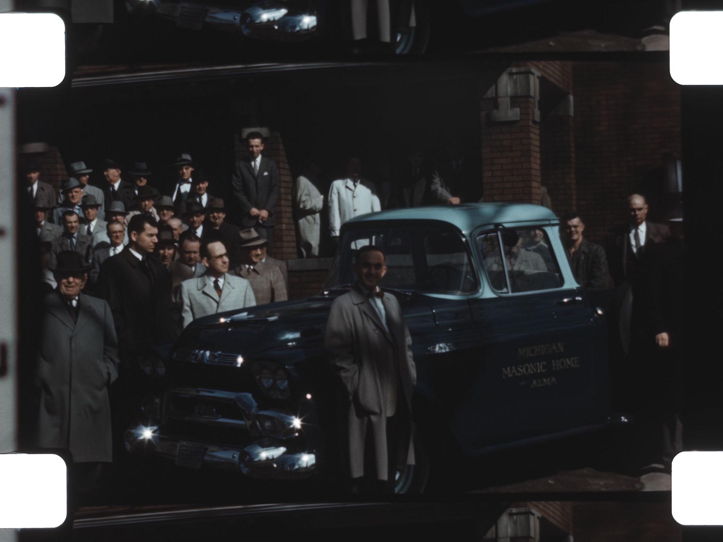 a group of men gathered around a truck that says Michigan Masonic Home